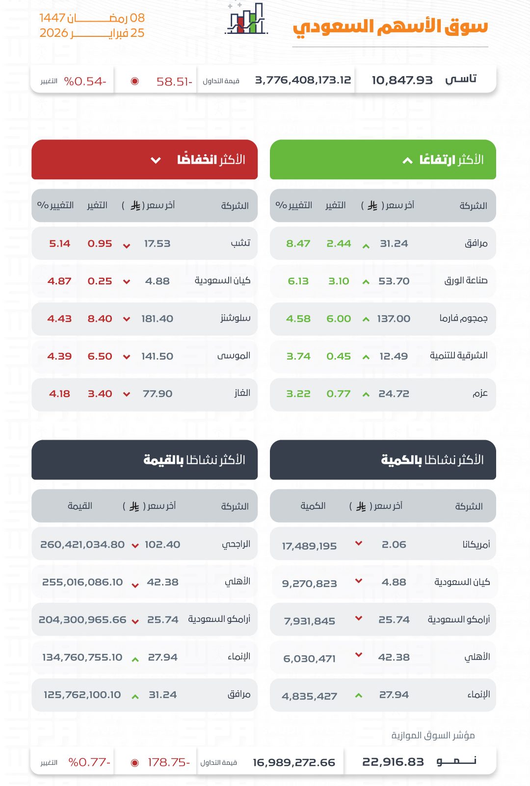 وكانت أسهم شركات مرافق، وصناعة الورق، وجمجوم فارما، والشرقية للتنمية، وعزم، الأكثر ارتفاعًا، أما أسهم شركات تْشب، وكيان السعودية، وسلوشنز، والموسى، والغاز الأكثر انخفاضًا في التعاملات، وتراوحت نسب الارتفاع والانخفاض ما بين (8.47%) و(5.14%)، فيما كانت أسهم شركات أمريكانا، وكيان السعودية، وأرامكو السعودية، والأهلي، والإنماء هي الأكثر نشاطًا بالكمية، بينما كانت أسهم شركات الراجحي، والأهلي، وأرامكو السعودية، والإنماء، ومرافق، هي الأكثر نشاطًا في القيمة.