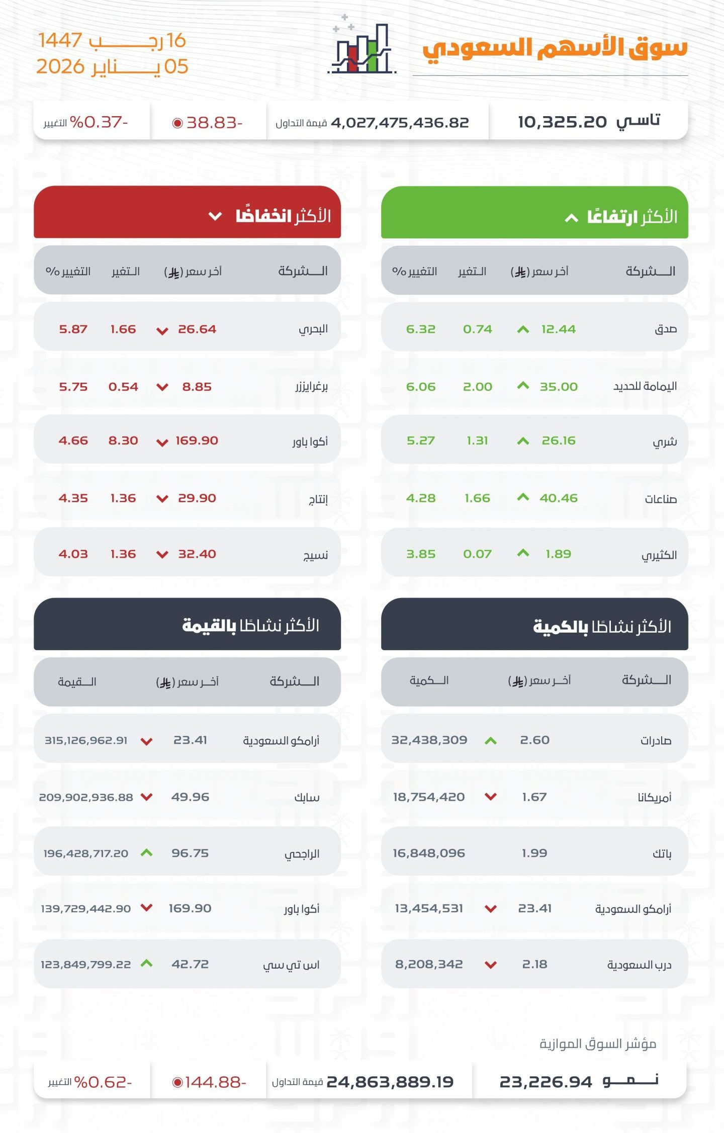 وكانت أسهم شركات صدق، واليمامة للحديد، وشري، والصناعات، والكثيري، الأكثر ارتفاعًا، أما أسهم شركات البحري، وبرغرايززر، وأكوا باور، وإنتاج، ونسيج الأكثر انخفاضًا في التعاملات، وتراوحت نسب الارتفاع والانخفاض ما بين (6.32%) و(5.87%)، فيما كانت أسهم شركات الصادرات، وأمريكانا، وباتك، وأرامكو السعودية، ودرب السعودية، هي الأكثر نشاطًا بالكمية، بينما كانت أسهم شركات أرامكو السعودية، وسابك، والراجحي، وأكوا باور، وstc، هي الأكثر نشاطًا في القيمة.