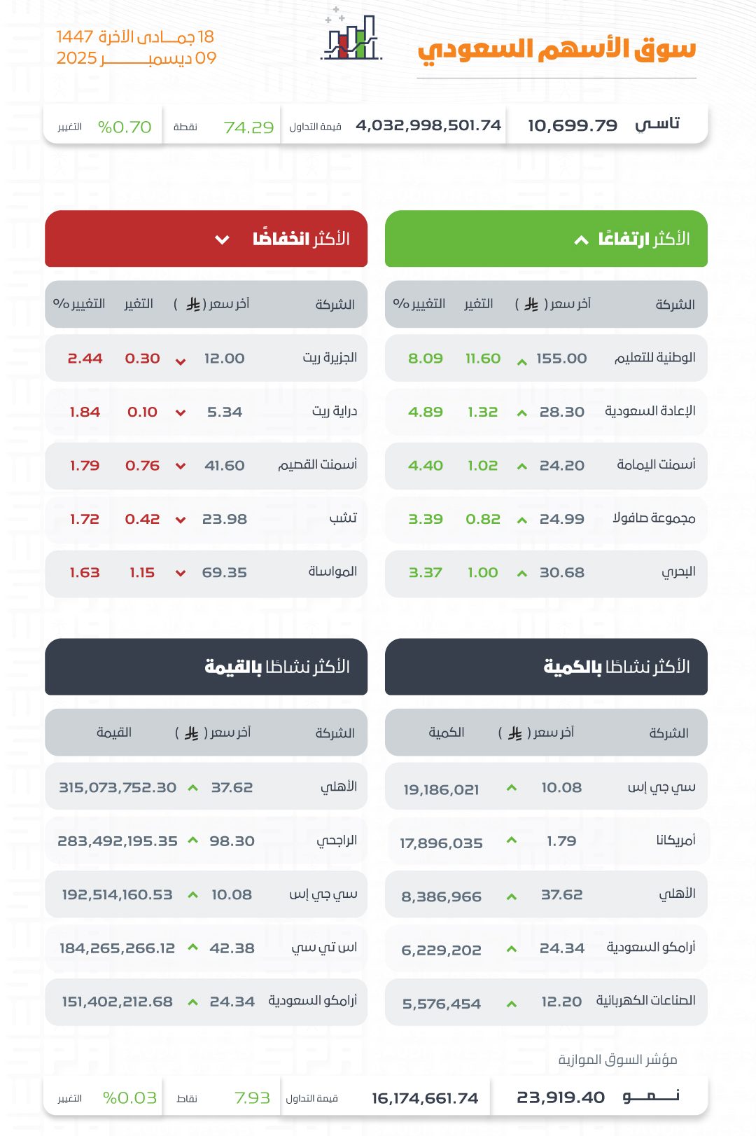 وكانت أسهم شركات الوطنية للتعليم، والباحة، وأسمنت اليمامة، ومجموعة صافولا، والبحري هي الأكثر ارتفاعاً، أما أسهم شركات الجزيرة ريت، ودراية ريت، وأسمنت القصيم، وتشب، والمواساة فكانت الأكثر انخفاضاً في التعاملات، حيث تراوحت نسب الارتفاع والانخفاض ما بين 8.09% و 2.44%.