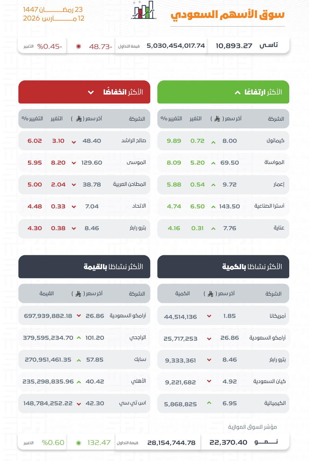 وكانت أسهم شركات كيمانول، والمواساة، وإعمار، وإسترا الصناعية، وعناية الأكثر ارتفاعًا، أما أسهم شركات صالح الراشد، والموسى، والمطاحن العربية، والاتحاد، وبترو رابغ الأكثر انخفاضًا في التعاملات، وتراوحت نسب الارتفاع والانخفاض ما بين (9.89%) و(6.02%)، فيما كانت أسهم شركات أمريكانا، وأرامكو السعودية، وبترو رابغ، وكيان السعودية، والكيميائية هي الأكثر نشاطًا بالكمية، بينما كانت أسهم شركات أرامكو السعودية، والراجحي، وسابك، والأهلي واس تي سي هي الأكثر نشاطًا في القيمة.
