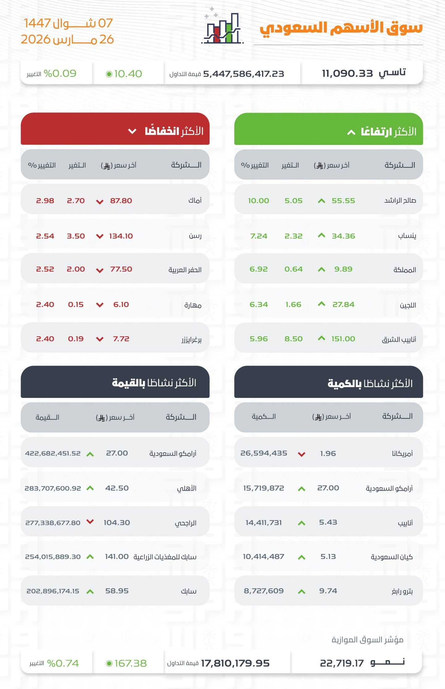 وكانت أسهم شركات صالح الراشد، وينساب، والمملكة، واللجين، وأنابيب الشرق الأكثر ارتفاعًا، أما أسهم شركات أماك، ورسن، والحفر العربية، ومهارة، وبرغرايززر الأكثر انخفاضًا في التعاملات، وتراوحت نسب الارتفاع والانخفاض ما بين (10.00%) و(2.98%)، فيما كانت أسهم شركات أمريكانا، وأرامكو السعودية، وأنابيب، وكيان السعودية، وبترو رابغ هي الأكثر نشاطًا بالكمية، بينما كانت أسهم شركات أرامكو السعودية، والأهلي، والراجحي، وسابك للمغذيات الزراعية، وسابك هي الأكثر نشاطًا في القيمة.