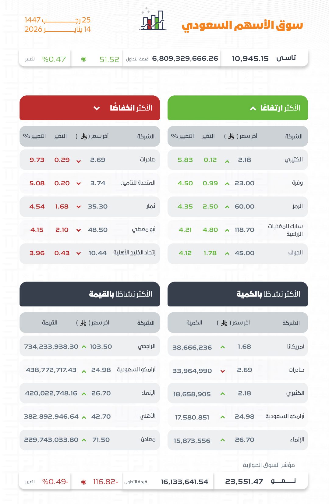 وبلغت نسبة الارتفاع (0.47%)، حيث شهدت الجلسة تباينًا في أداء الشركات، إذ سجلت أسهم شركات الكثيري، ووفرة، والرمز، وسابك للمغذيات الزراعية، والجوف، الأكثر ارتفاعًا في قيمتها، في حين كانت أسهم شركات صادرات، والمتحدة للتأمين، وثمار، وأبو معطي، واتحاد الخليج الأهلية، الأكثر انخفاضًا في التعاملات، وتراوحت نسب الارتفاع والانخفاض بين (5.83%) و (9.73%).