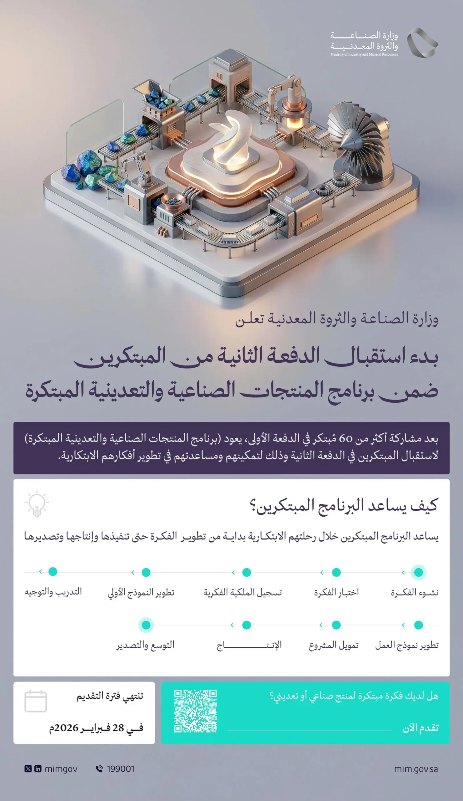 ويستمر استقبال الدفعة الثانية من الأفكار الابتكارية حتى 28 فبراير 2026م، حيث يمكن للمبتكرين ورواد الأعمال تقديم أفكارهم والانضمام لبرنامج المنتجات الصناعية والتعدينية المبتكرة عبر منصة البرنامج: https://www.mim.gov.sa/ar/programs/innovation-program.