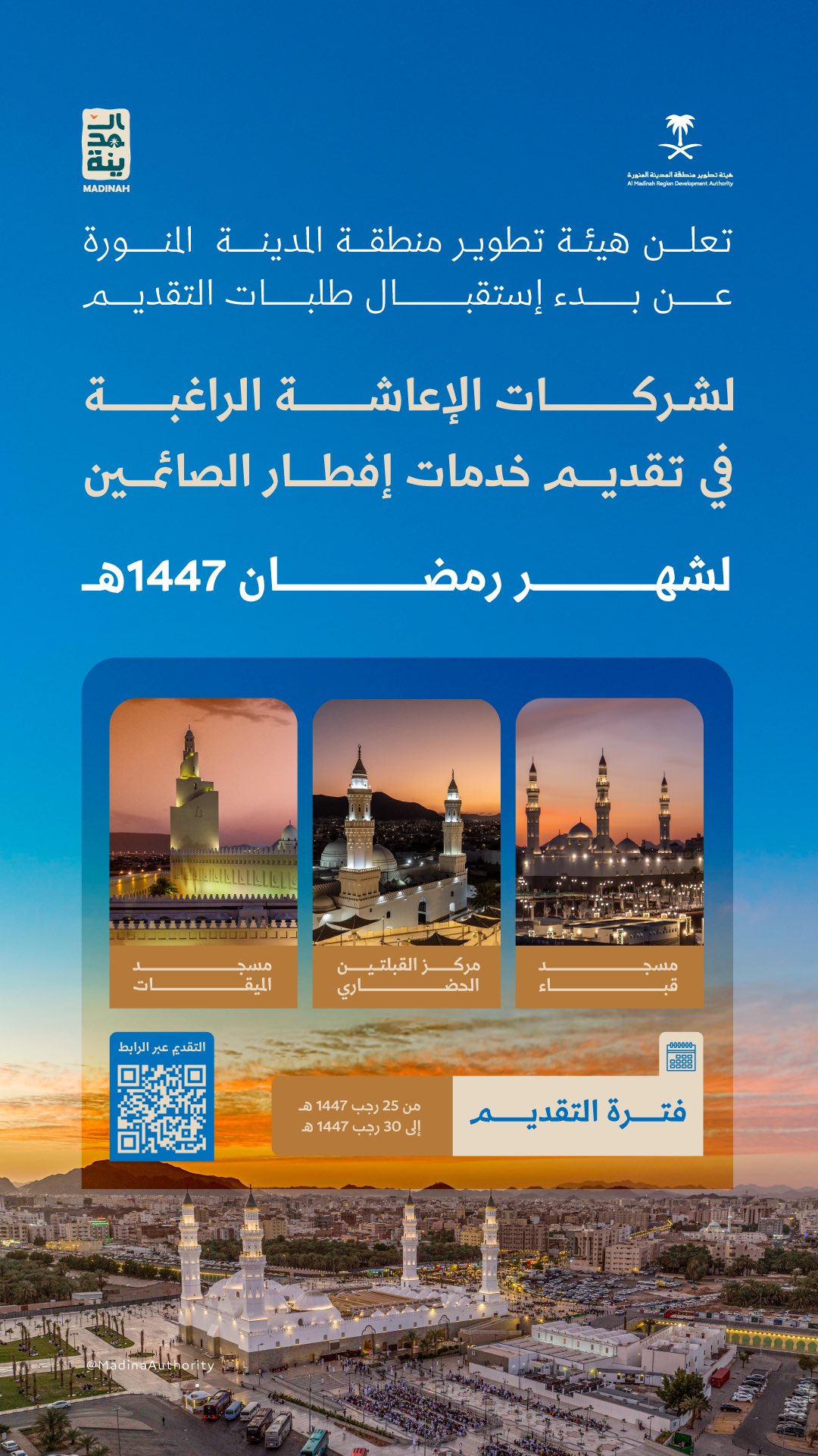 أعلنت هيئة تطوير المدينة المنورة بدء استقبال طلبات شركات الإعاشة لخدمة تقديم وجبات “إفطار صائم” خلال شهر رمضان المبارك في عددٍ من المساجد التاريخية، وتشمل: مسجد قباء، ومسجد الميقات، ومركز القبلتين الحضاري.