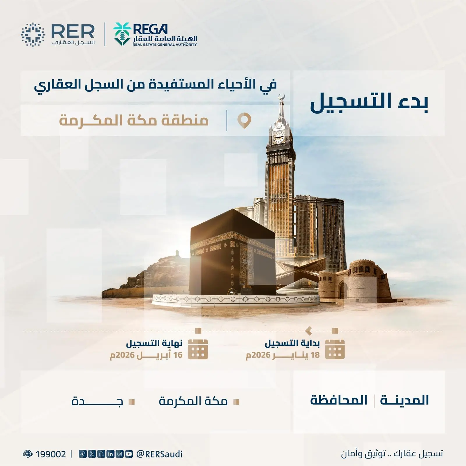 ويشمل التسجيل جزءًا من حي الوادي في منطقة مكة المكرمة بمحافظة جدة، وجزءًا من حي أجياد بمكة المكرمة، حيث يجب على مُلاك العقارات الواقعة في نطاق هذه الأحياء تسجيل عقاراتهم قبل نهاية يوم الخميس 16 أبريل 2026، كما يبدأ تسجيل جزء من حي المحبوبة في منطقة المدينة المنورة حتى نهاية الخميس 23 أبريل 2026م.