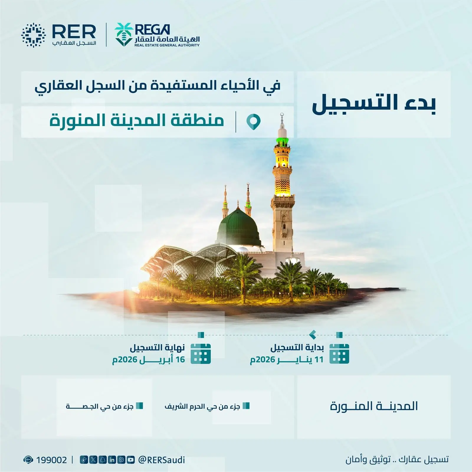 ويشمل التسجيل الأحياء التالية بمنطقة مكة المكرمة في محافظة جدة: أجزاء من حي التعاون، وأجزاء من حي التضامن، وجزء من حي البشائر، وجزء من حي الصناعية، وجزء من حي الخمرة، كما يشمل التسجيل الأحياء التالية في المدينة المنورة: جزء من حي الحرم الـشريف، وجزء من حي الجصة، ويجب على ملاك العقارات الواقعة في نطاق الأحياء تسجيل عقارتهم قبل نهاية يوم الخميس 16 أبريل 2026م.
