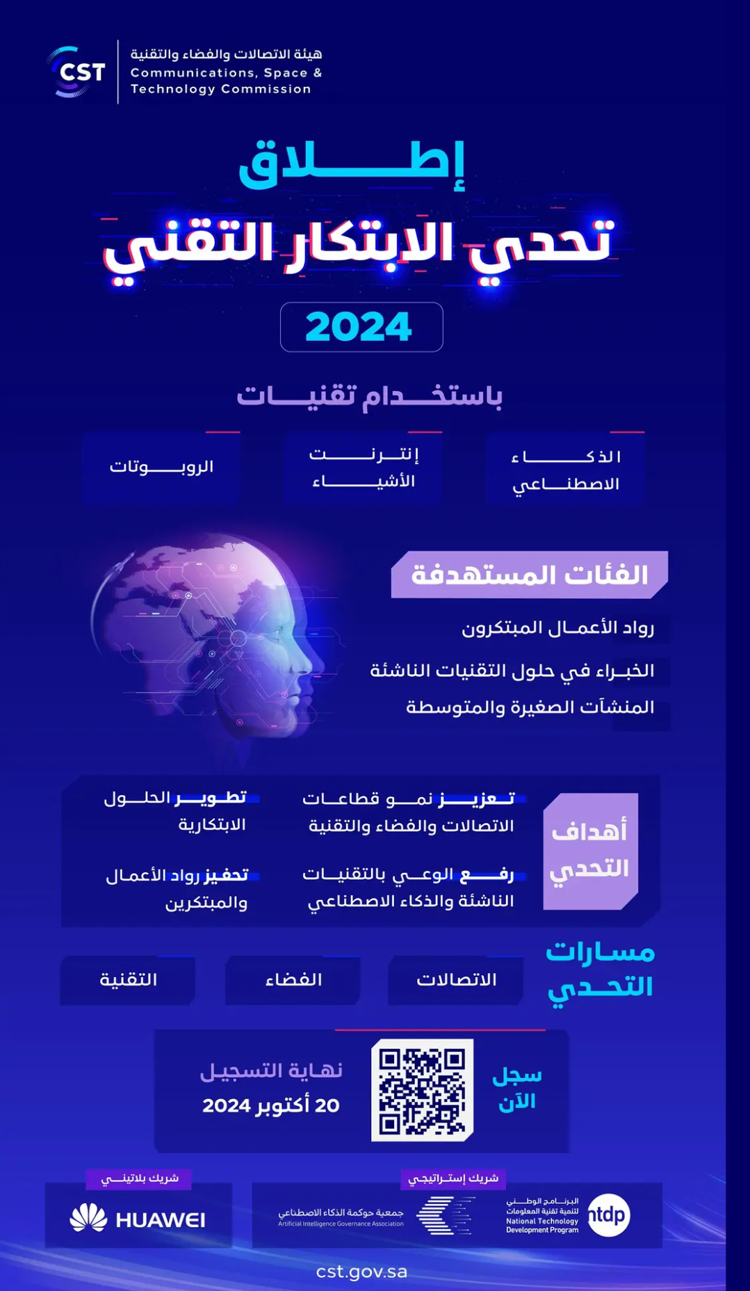 أطلقت هيئة الاتصالات والفضاء والتقنية اليوم, تحدي الابتكار التقني 2024، بالشراكة مع البرنامج الوطني لتنمية تقنية المعلومات NTDP، وشركة هواوي، وجمعية حوكمة الذكاء الاصطناعي.