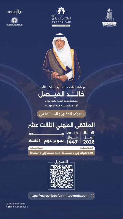 تحت رعاية كريمة من صاحب السمو الملكي الأمير خالد الفيصل، مستشار خادم الحرمين الشريفين أمير منطقة مكة المكرمة، أعلنت جامعة الملك عبدالعزيز عن تنظيم النسخة الثالثة عشرة من الملتقى المهني، والذي يعد منصة استراتيجية رائدة تجمع الباحثين عن الفرص الوظيفية مع جهات التوظيف والتطوير المهني تحت سقف واحد، لتعزيز التواصل بين الكوادر الوطنية وسوق العمل.