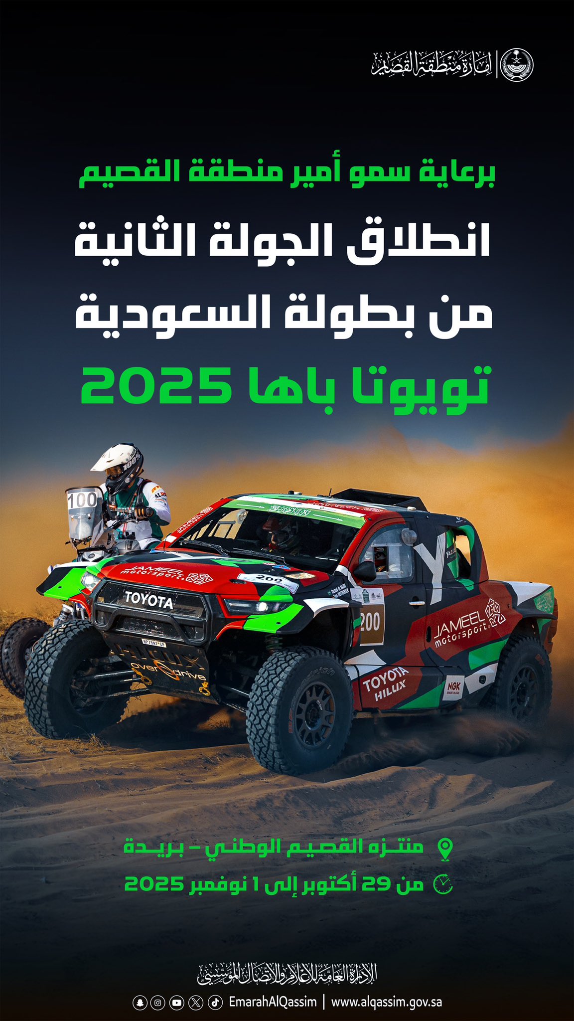 يُذكر أن “باها القصيم تويوتا” يُعدّ الجولة الثانية من بطولة السعودية تويوتا باها 2025م، بعد انطلاق الجولة الأولى في حائل، فيما تختتم البطولة في “باها جدة تويوتا” خلال الفترة من 3 إلى 6 ديسمبر 2025م.