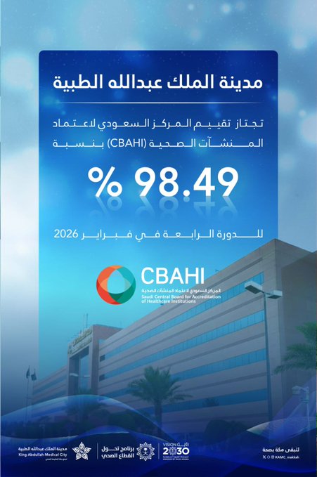 أعلنت مدينة الملك عبدالله الطبية عن تحقيق إنجاز وطني جديد في مسيرة الجودة والتميز الصحي، حيث تمكنت من اجتياز تقييم المركز السعودي لاعتماد المنشآت الصحية (CBAHI) بنسبة بلغت 98.49٪ ضمن الدورة الرابعة لشهر فبراير 2026. ويعكس هذا الرقم المرتفع التزام المدينة الراسخ بتطبيق أعلى معايير الجودة وسلامة المرضى في كافة مرافقها وخدماتها العلاجية.