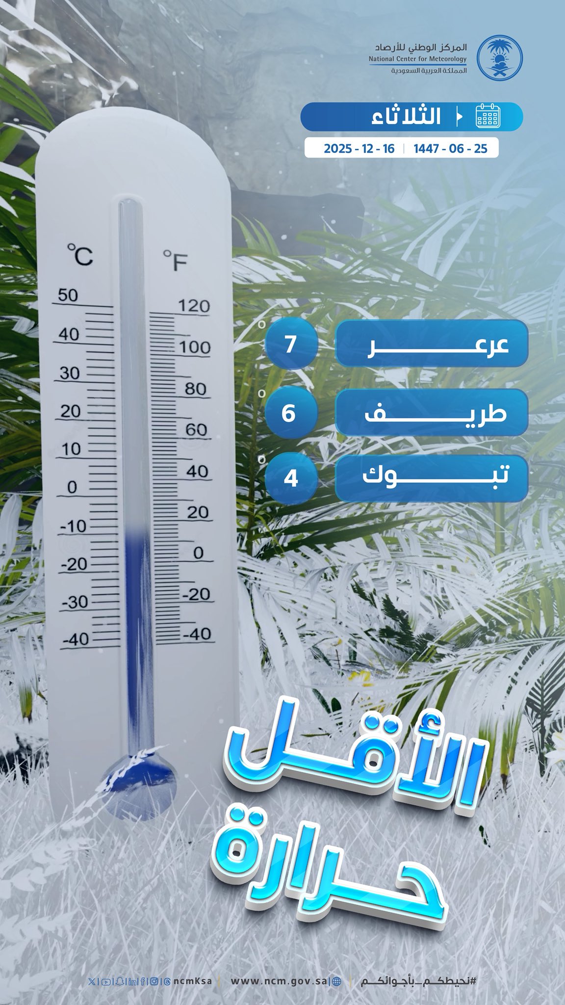 أعلن المركز الوطني للأرصاد تسجيل أقل درجات الحرارة اليوم الثلاثاء 16 ديسمبر 2025م (25جمادى الآخرة 1447هـ) في عدد من مناطق المملكة، حيث سجّلت تبوك أدنى درجة حرارة بواقع 4 درجات مئوية، تلتها طريف بـ 6 درجات مئوية.