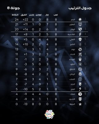 تصدر نادي النصر جدول ترتيب دوري روشن السعودي بعد ختام الجولة الثامنة برصيد 24 نقطة من 8 مباريات، مواصلاً أداءه القوي هذا الموسم، وجاء التعاون في المركز الثاني برصيد 21 نقطة، بينما حل الهلال في المركز الثالث برصيد 20 نقطة بعد تعثره الأخير.