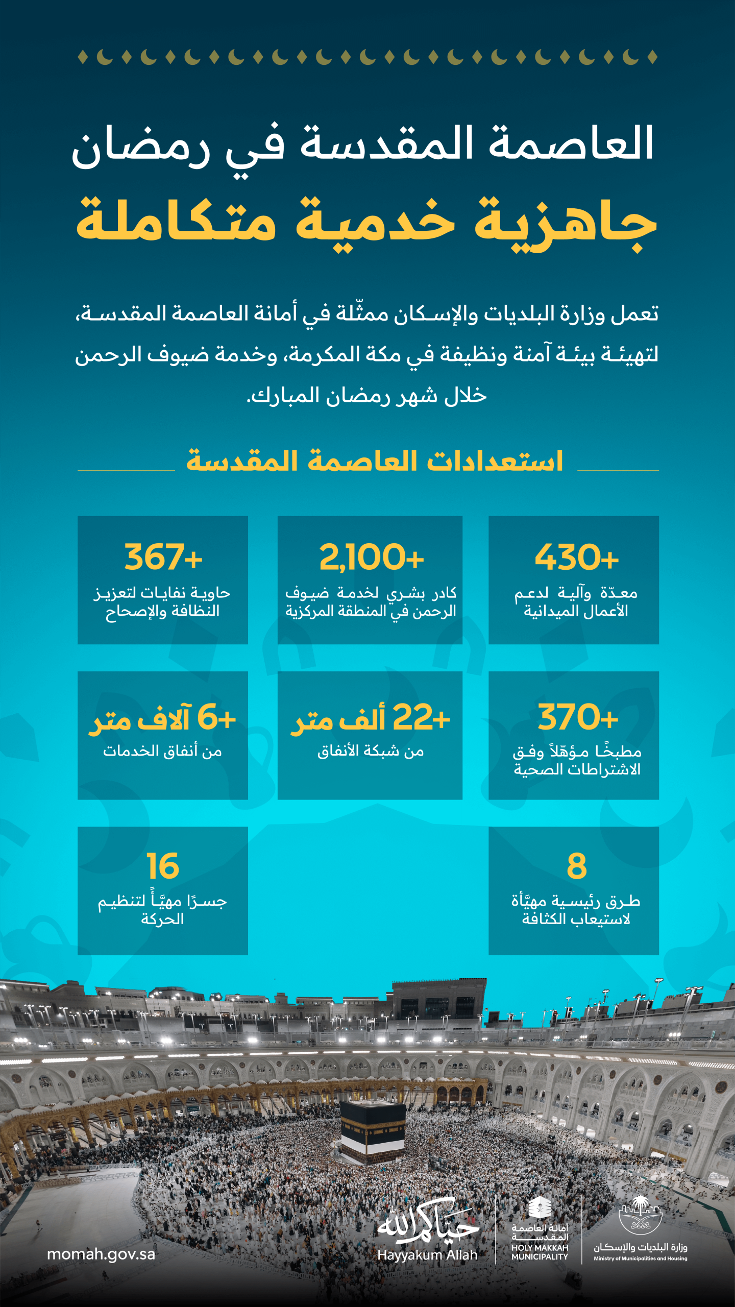 رفعت وزارة البلديات والإسكان مستوى جاهزية منظومة خدماتها البلدية في العاصمة المقدسة لموسم رمضان والعمرة لعام 1447هـ، عبر خطط تشغيلية وخدمية متكاملة تنفّذها الوزارة، ممثّلة في أمانة العاصمة المقدسة.