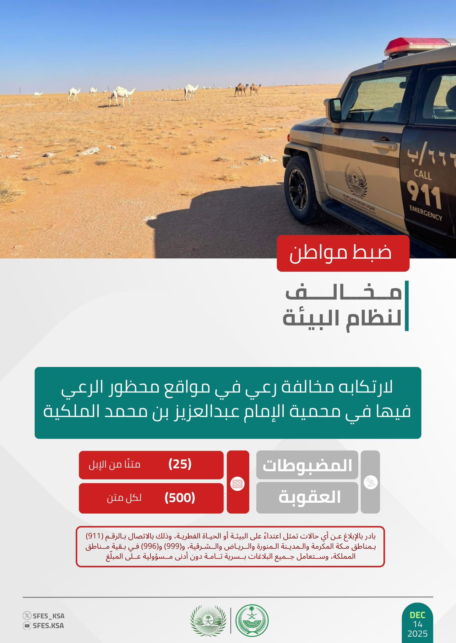 وأكدت القوات أن عقوبة رعي الإبل غرامة (500) ريال لكل متن، حاثةً على الإبلاغ عن أي حالات تمثل اعتداءً على البيئة أو الحياة الفطرية على الرقم (911) بمناطق مكة المكرمة والمدينة المنورة والرياض والشرقية، و(999) و(996) في بقية مناطق المملكة، وستعامل جميع البلاغات بسرية تامة دون أدنى مسؤولية على المبلّغ.