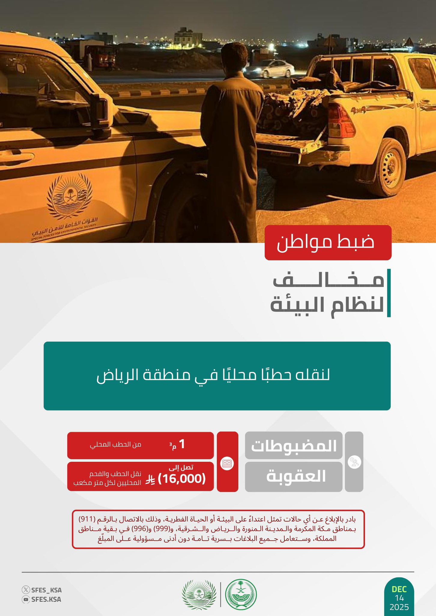 و ضبطت القوات الخاصة للأمن البيئي مواطنًا مخالفًا لنظام البيئة، لنقله مترًا مكعبًا من الحطب المحلي في منطقة الرياض، وطُبقت الإجراءات النظامية بحقه، وسُلمت الكميات المضبوطة للجهة المختصة.
