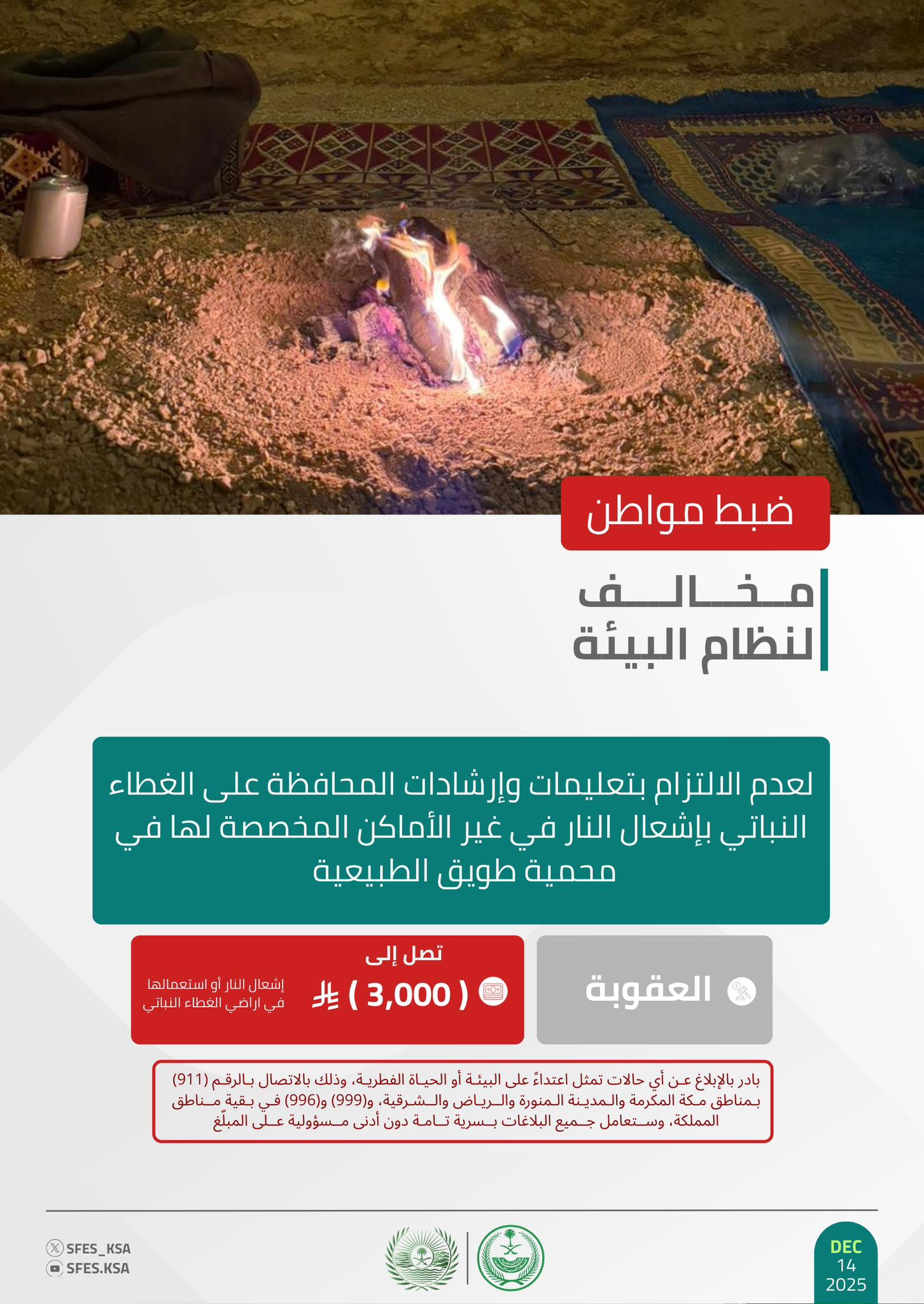 وأكدت القوات أن عقوبة إشعال النار في غير الأماكن المخصصة لها في الغابات والمتنزهات الوطنية غرامة تصل إلى (3,000) ريال، حاثة على الإبلاغ عن أي حالات تمثل اعتداءً على البيئة أو الحياة الفطرية على الرقم (911) بمناطق مكة المكرمة والمدينة المنورة والرياض والشرقية، و(999) و(996) في بقية مناطق المملكة، وستعامل جميع البلاغات بسرية تامة دون أدنى مسؤولية على المبلّغ.
