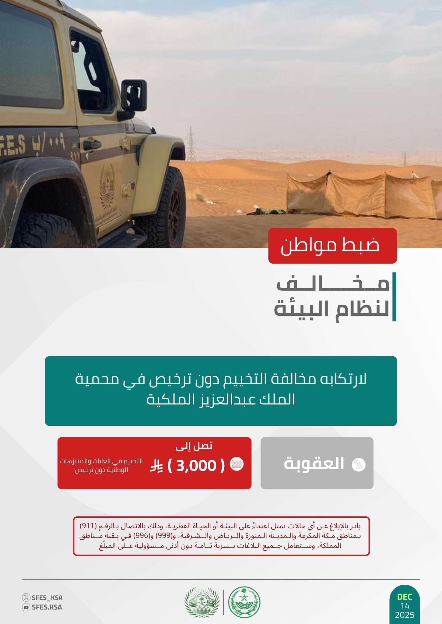 وأوضحت القوات أن عقوبة مخالفة التخييم في الغابات أو المتنزهات الوطنية دون ترخيص غرامة تصل إلى (3,000) ريال، حاثةً على الإبلاغ عن أي حالات تمثل اعتداءً على البيئة أو الحياة الفطرية على الرقم (911) بمناطق مكة المكرمة والمدينة المنورة والرياض والشرقية، و(999) و(996) في بقية مناطق المملكة، وستعامل جميع البلاغات بسرية تامة دون أدنى مسؤولية على المبلّغ.