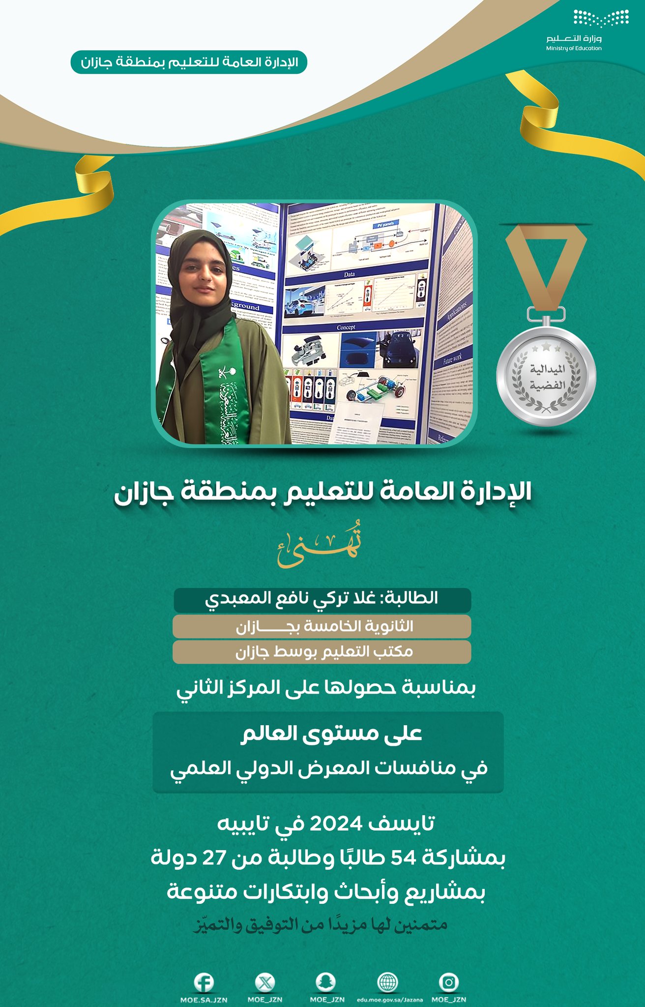 وحصدت الطالبة غلا تركي نافع المعبدي من الثانوية الخامسة بجازان التابعة لمكتب التعليم بوسط جازان المركز الثاني على مستوى العالم في منافسات المعرض الدولي العلمي تايسف 2024م ، كما حصدت الميدالية الفضية عن بحثها النوعي في مجال هندسة البيئة ، وذلك ضمن الوفد السعودي المشارك بعدد من الأبحاث والابتكارات المتنوعة.