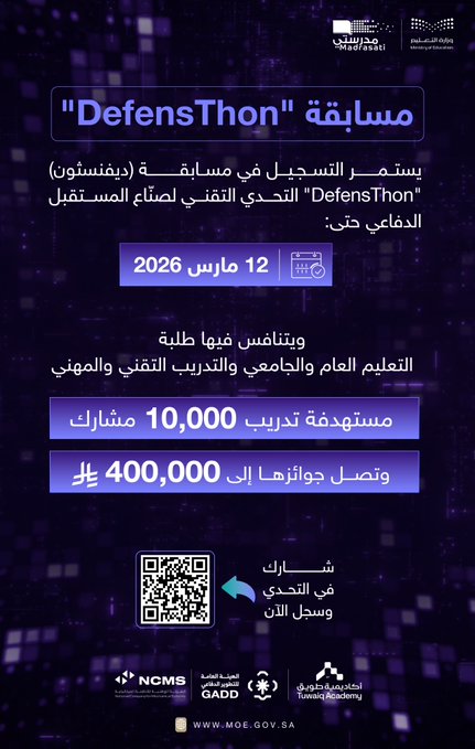 دعت الإدارة العامة للتعليم بمنطقة نجران كافة الطلاب والطالبات في مختلف المراحل التعليمية إلى المبادرة بالتسجيل في مسابقة DefensThon (ديفنسثون)، التي تمثل التحدي التقني الأبرز لصُنّاع المستقبل في المجالات الدفاعية. وتهدف هذه المسابقة الوطنية إلى تعزيز القدرات الابتكارية لدى الكوادر الشابة وتطوير مهاراتهم في إيجاد حلول تقنية متقدمة تخدم القطاع الدفاعي والأمني بالمملكة، بما يتماشى مع التطورات التقنية المتسارعة.