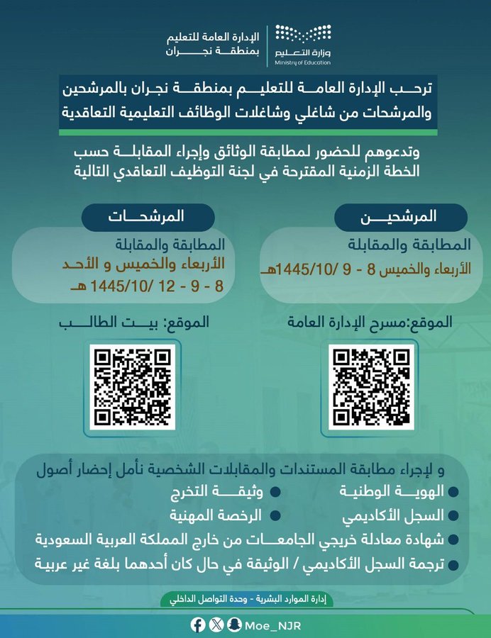 #تعليم_نجران يدعو المرشحين والمرشحات على الوظائف التعاقدية للمطابقة والمقابلة الشخصية