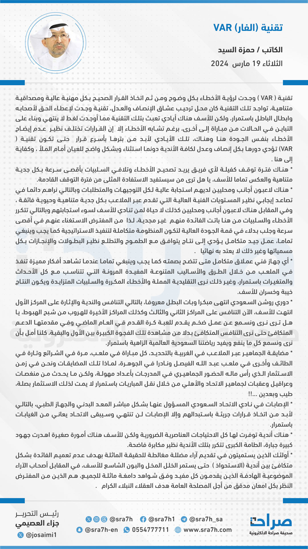 تقنية ( VAR ) وجدت لرؤية الأخطاء بكل وضوح ومن ثم اتخاذ القرار الصحيح بكل مهنية عالية ومصداقية متناهية، تواجد تلك التقنية كان محل ترحيب عشاق الإنصاف والعدل، تقنية وجدت لإعطاء الحق لأصحابه وابطال الباطل باستمرار، ولكن للأسف هناك أيادي تعبث بتلك التقنية مما أوجدت لغط لا ينتهي وبناء على التباين في الحالات من مباراة إلى أخرى، برغم تشابه الأخطاء إلا إن القرارات تختلف نظير عدم إيضاح الأخطاء بنفس الجودة هنا وهناك، تلك الأيادي لأبد من بترها بأسرع قرار حتى تكون تقنية ( VAR) تؤدي دورها بكل إنصاف وعدل لكافة الأندية دونما استثناء وبشكل واضح للعيان أمام الملأ ، وكفاية إلى هنا .