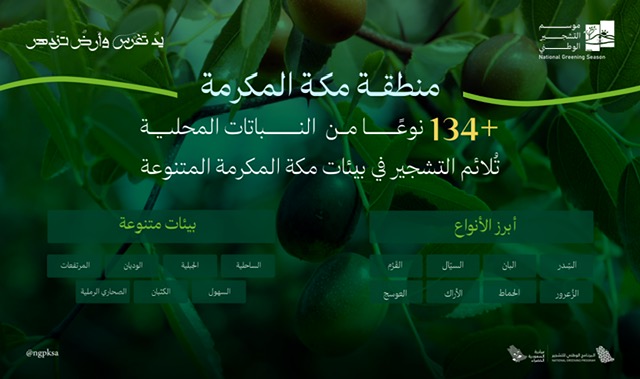 أكد البرنامج الوطني للتشجير، عن انتشار أكثر من 134 نوعًا من النباتات المحلية الملائمة للتشجير في منطقة مكة المكرمة؛ مما يُسهم في تعزيز الجهود الوطنية لتنمية الغطاء النباتي، والحد من تدهور الأراضي في المنطقة، ودعم تحقيق مستهدفات مبادرة السعودية الخضراء، للإسهام في ترسيخ أهمية زراعة النباتات المحلية الملائمة للبيئات المتنوعة، وتحقيق الاستدامة البيئية، تماشيًا مع مستهدفات رؤية المملكة 2030.