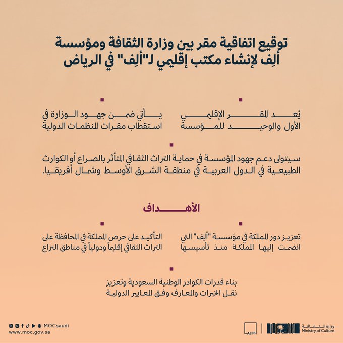 ويأتي إنشاء مقر مؤسسة ألِف في الرياض ضمن جهود وزارة الثقافة في استقطاب مقرات المنظمات الدولية، وتعزيز دور المملكة في مؤسسة “ألِف” التي انضمت إليها المملكة منذ تأسيسها، إضافة إلى تأكيد حرص المملكة في المحافظة على التراث الثقافي إقليميًّا ودوليًّا في مناطق النزاع، ودعمها للجهود الدولية الإنسانية والتنموية عالميًّا، كما يهدف استقطاب المكتب الإقليمي إلى بناء قدرات الكوادر الوطنية السعودية، وتعزيز نقل الخبرات والمعارف وفق المعايير الدولية، بما يتوافق مع مستهدفات الإستراتيجية الوطنية للثقافة، تحت مظلة رؤية المملكة 2030.