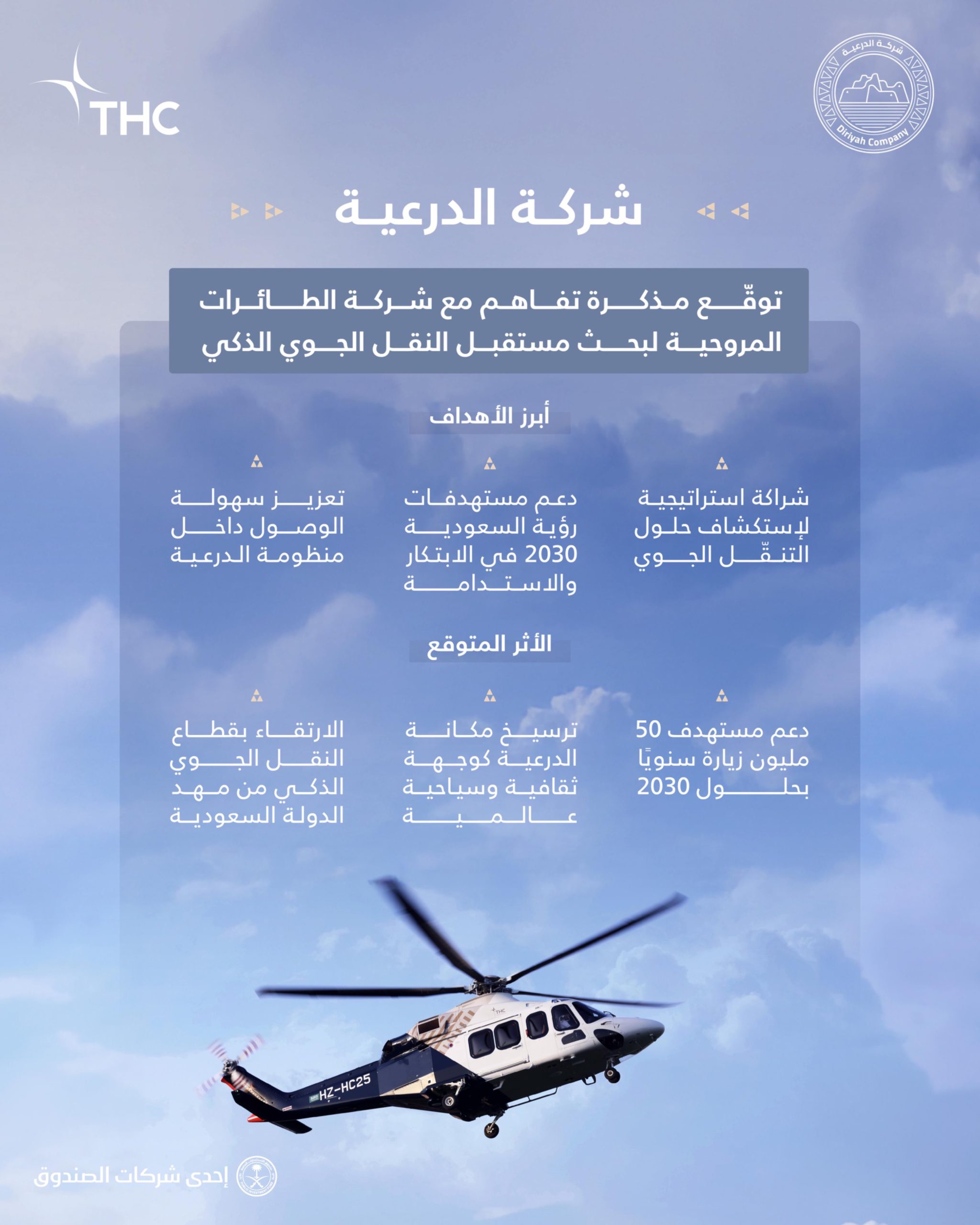 واتّفق الجانبان على تشكيل فريق عملٍ مشترك يضم ممثلين من شركة الدرعية وشركة الطائرات المروحية، لبحث فرص التعاون وإمكانية الاستفادة من خدمات النقل الجوي الحضري المبتكرة في مشروع الدرعية، حيث يُتوقّع أن تُسهم عند تطبيقها في إحداث نقلةٍ نوعيةٍ في قطاع النقل الجوي الحضري والسياحة في المملكة، وتعزيز مكانة الدرعية وجهةً عالميةً رائدةً، تماشيًا مع مستهدفات رؤية المملكة 2030.