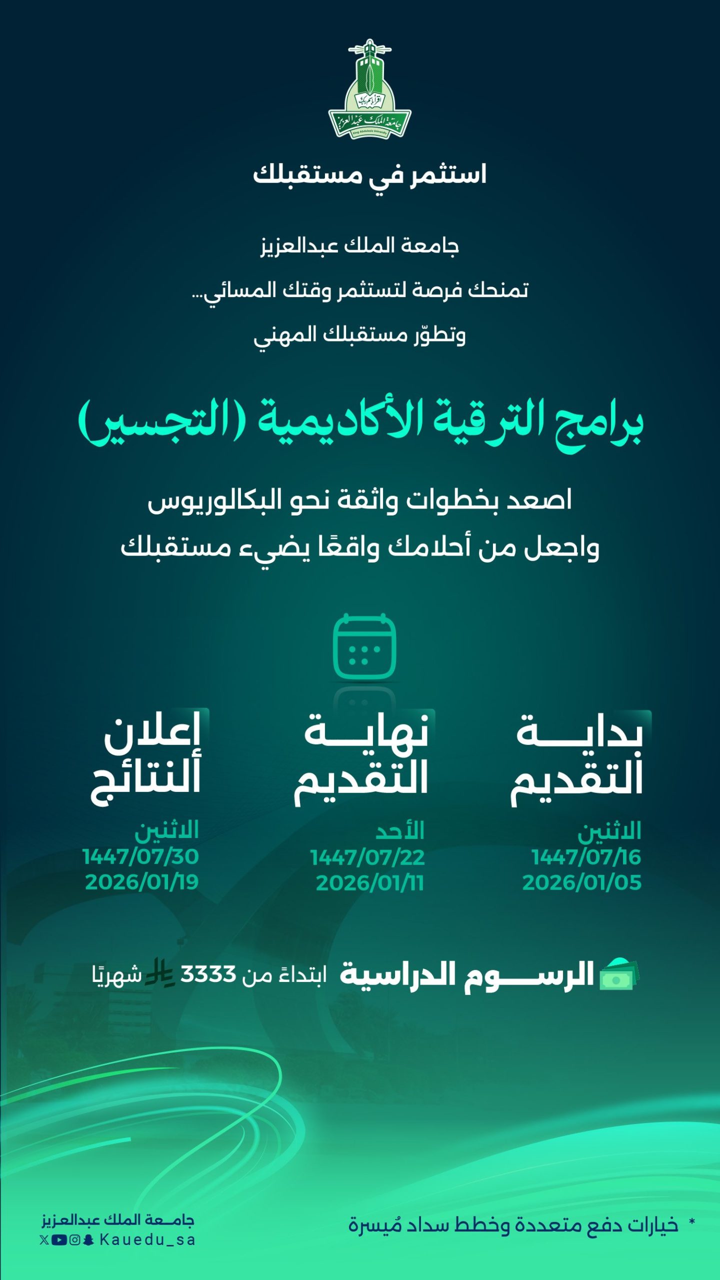 أعلنت جامعة الملك عبدالعزيز، عن بدء التقديم على برامج الترقية الأكاديمية (التجسير)، والتي تمنح الطلاب فرصة الحصول على درجة البكالوريوس، واستثمار وقتهم المسائي في تطوير مستقبلهم المهني وتحويل خبراتهم إلى مؤهل أكاديمي معتمد.