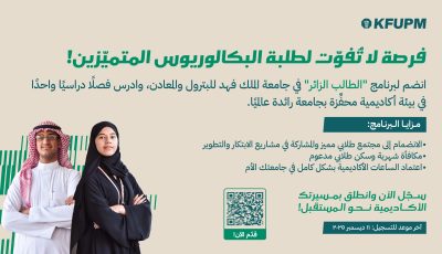 أعلنت جامعة الملك فهد للبترول والمعادن عن فتح باب التسجيل في برنامج “الطالب الزائر”، والذي يتيح لطلبة البكالوريوس المتميزين فرصة دراسة فصل دراسي واحد في بيئة أكاديمية محفزة داخل الجامعة، التي تُعد من أبرز الجامعات الرائدة عالميًا.