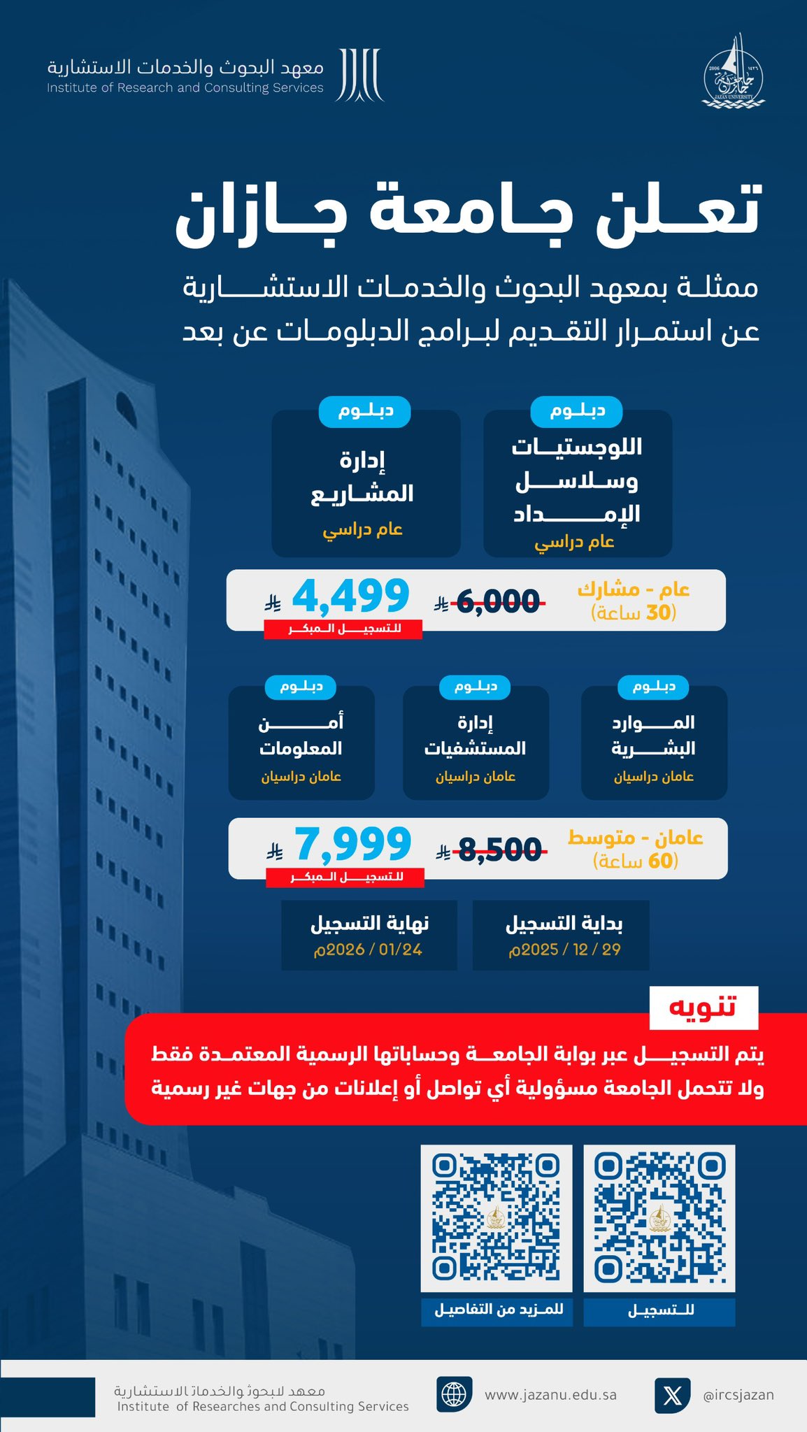 تواصل جامعة جازان ممثلةً بمعهد البحوث والخدمات الاستشارية استقبال طلبات الالتحاق ببرامج الدبلومات عن بُعد، حتى يوم السبت 2026/01/24م.