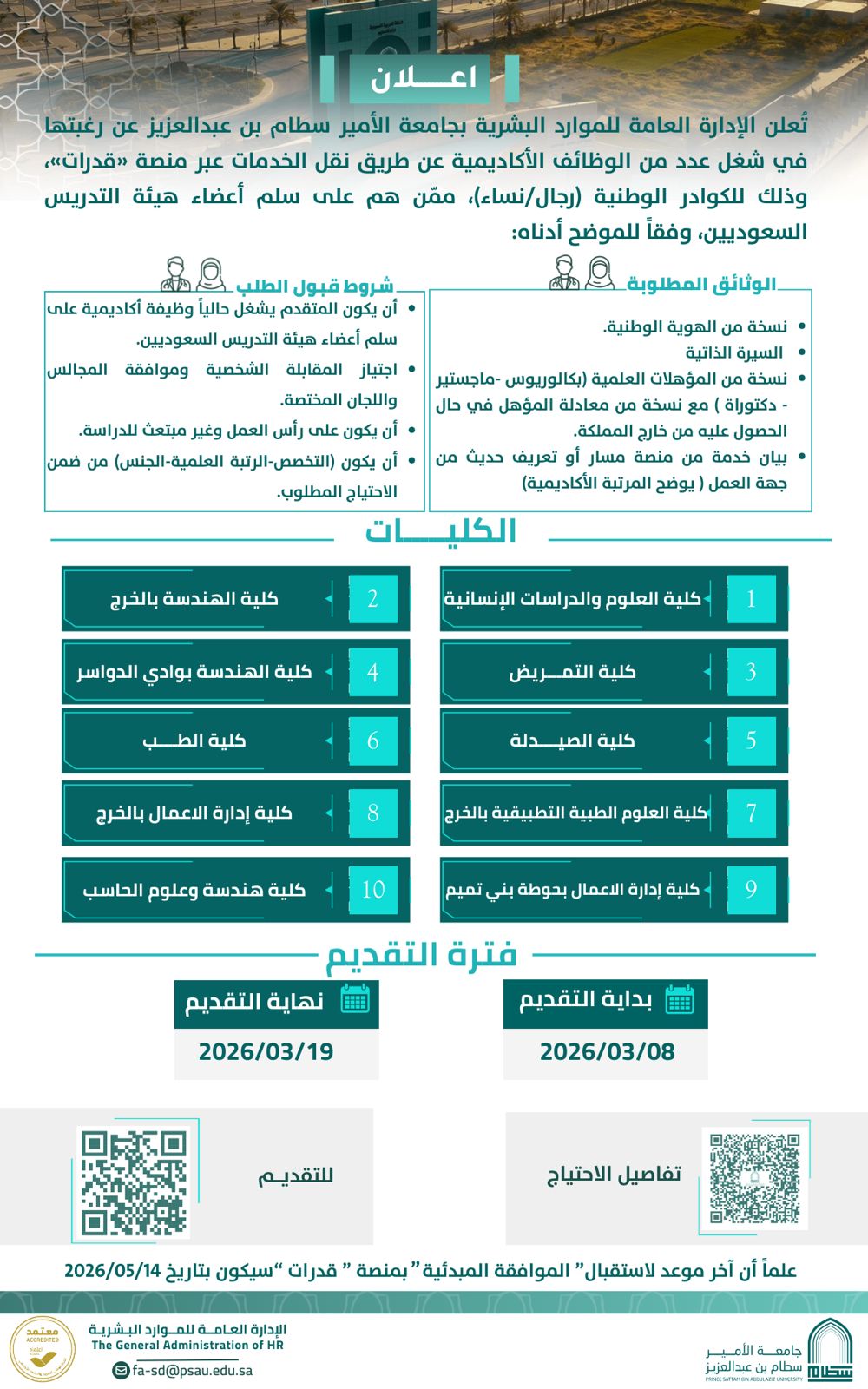 وأكدت جامعة الأمير سطام أن التقديم يتطلب إرفاق عدد من الوثائق، من أبرزها نسخة من الهوية الوطنية، والسيرة الذاتية، ونسخ من المؤهلات العلمية، وبيان خدمة حديث من جهة العمل يوضح المرتبة الأكاديمية، مشيرة إلى أن آخر موعد لاستقبال الموافقة المبدئية عبر منصة «قدرات» سيكون بتاريخ 14 مايو 2026