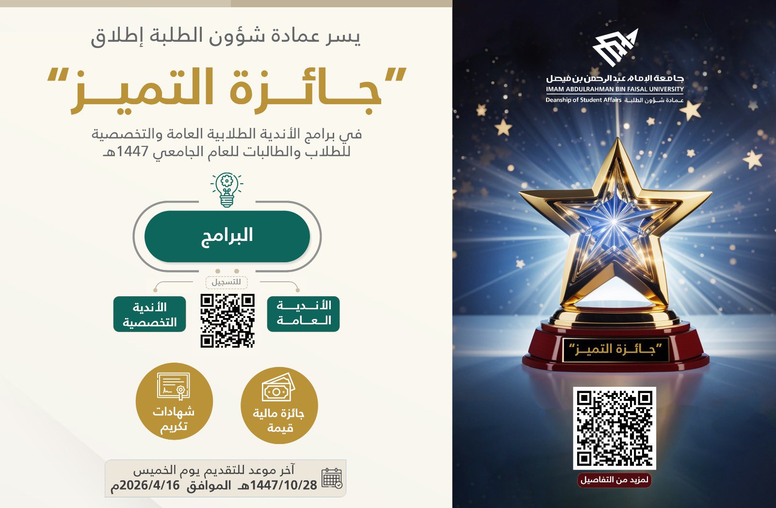 أعلنت عمادة شؤون الطلبة بجامعة الإمام عبدالرحمن بن فيصل عن إطلاق “جائزة التميز” المخصصة لبرامج الأندية الطلابية للعام الجامعي 1447هـ، وذلك في إطار سعي الجامعة لتحفيز المبادرات المبدعة والأنشطة النوعية التي تسهم في صناعة أثر طلابي متميز وملموس داخل البيئة الأكاديمية.