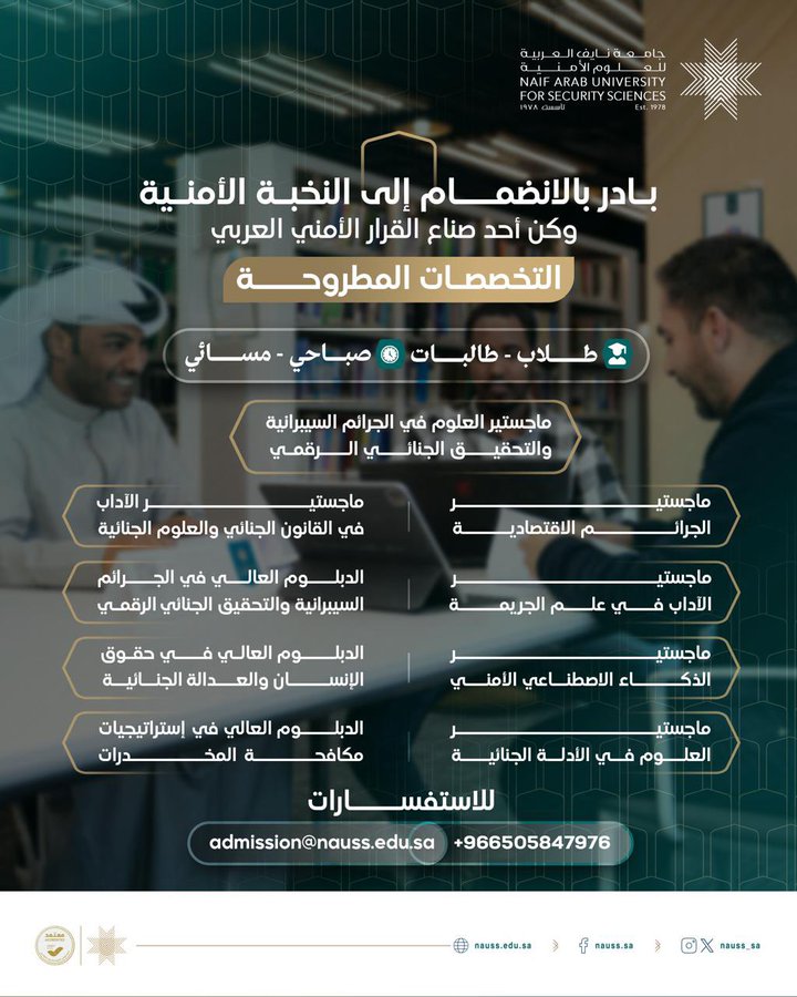 #جامعة_نايف_العربية تفتح باب القبول في برامج الماجستير والدبلوم العالي