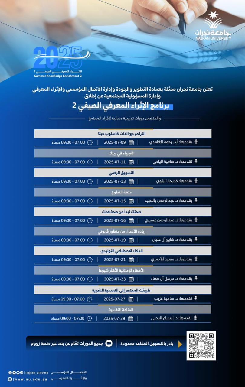 صراحة – عبدالله آل قريع: تطلق جامعة نجران ممثلةً في الإدارة العامة للاتصال المؤسسي والإثراء المعرفي وإدارة المسؤولية المجتمعية برنامج “الإثراء المعرفي الصيفي” في نسخته الثانية والمتضمن عشر دورات تدريبية مجانيّة في مسارات علمية مختلفة يقدمها نخبة من أعضاء هيئة التدريس والممارسين والموجهة إلى أفراد المجتمع وذلك عبر منصة الزوم، خلال الفترة 9 – 29 يوليو.