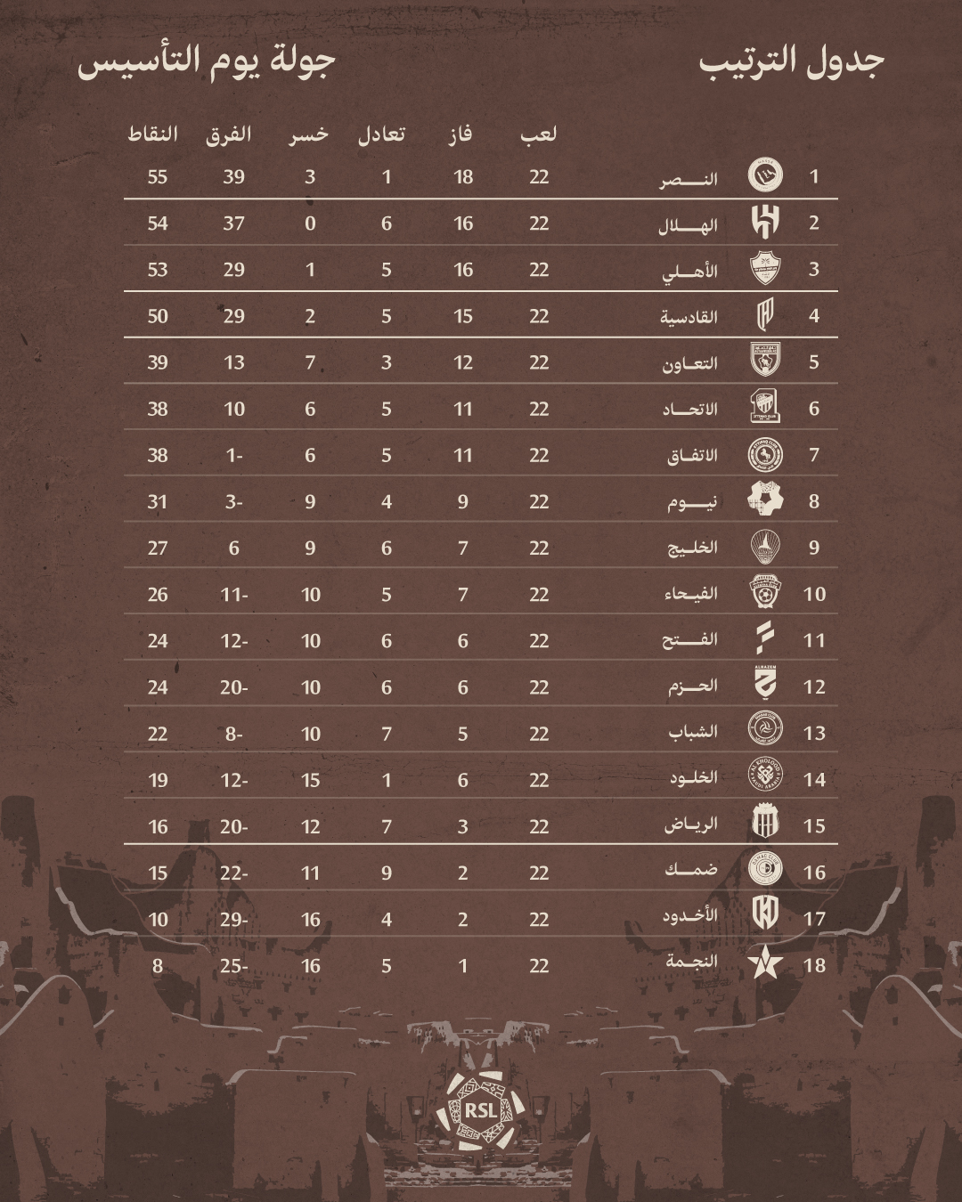 جدول ترتيب دوري روشن بعد جولة يوم التأسيس.. النصر يتصدر والهلال يلاحقه