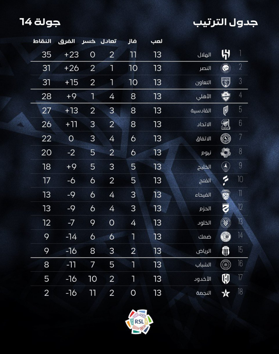 واصل فريق الهلال تصدره جدول ترتيب دوري روشن السعودي عقب ختام منافسات الجولة الرابعة عشرة، بعدما جمع 35 نقطة من 13 مباراة، محافظًا على الصدارة بفارق مريح عن أقرب منافسيه.