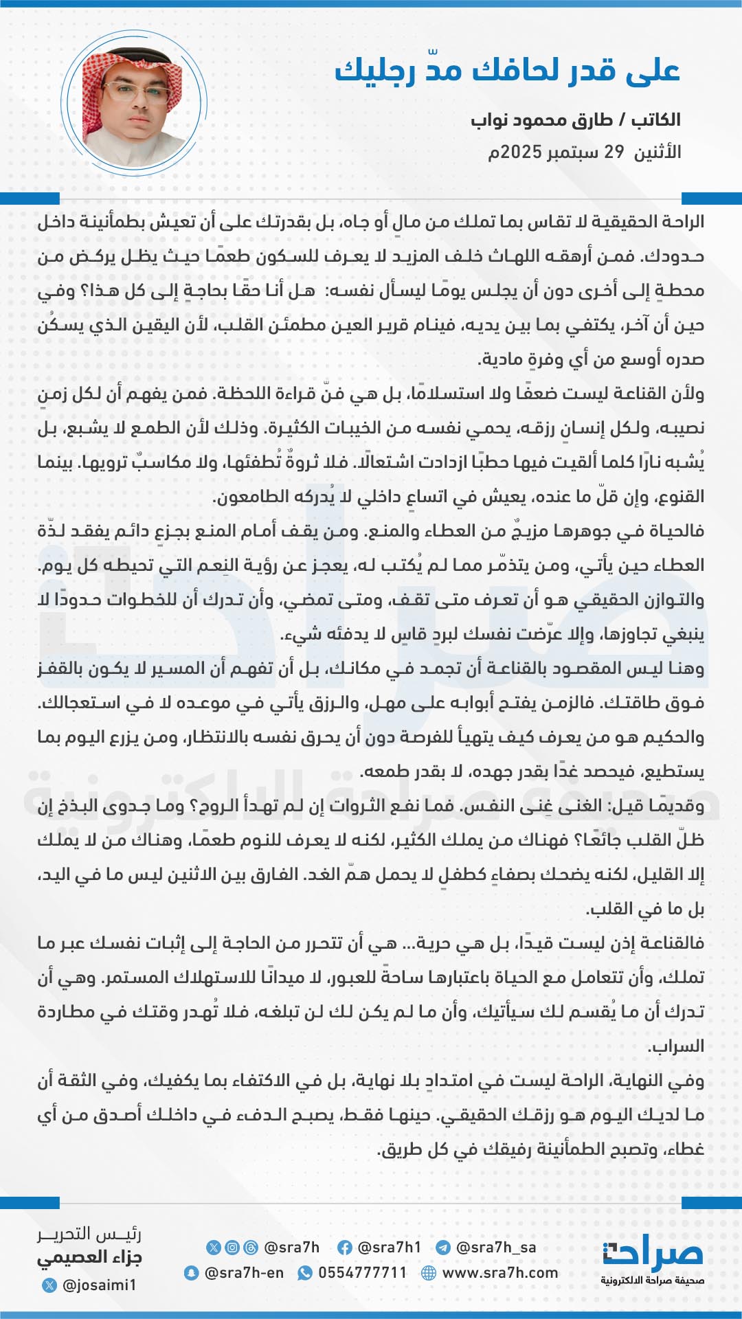 الراحة الحقيقية لا تقاس بما تملك من مالٍ أو جاه، بل بقدرتك على أن تعيش بطمأنينة داخل حدودك. فمن أرهقه اللهاث خلف المزيد لا يعرف للسكون طعمًا حيث يظل يركض من محطةٍ إلى أخرى دون أن يجلس يومًا ليسأل نفسه: هل أنا حقًا بحاجةٍ إلى كل هذا؟ وفي حين أن آخر، يكتفي بما بين يديه، فينام قرير العين مطمئن القلب، لأن اليقين الذي يسكُن صدره أوسع من أي وفرةٍ مادية.