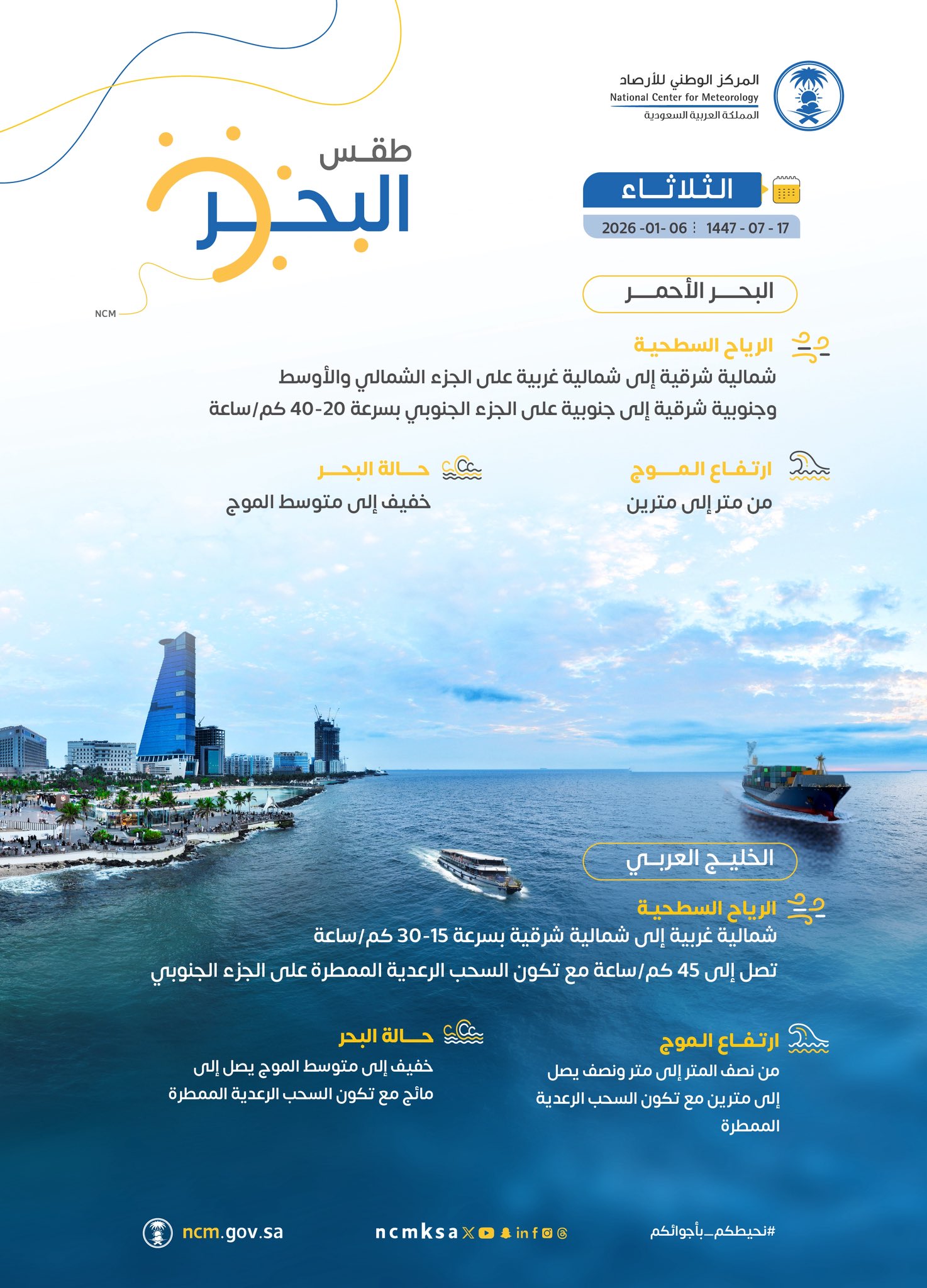 حالة البحر خفيف إلى متوسط الموج، وقد يصل إلى مائج.