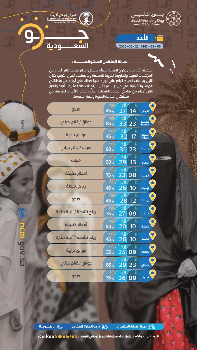 توقّع المركز الوطني للأرصاد في تقريره اليومي عن حالة الطقس –بمشيئة الله تعالى– هطول أمطار خفيفة على أجزاء من المرتفعات الغربية والجنوبية الغربية للمملكة، مع احتمالية تكوّن الضباب خلال الليل وساعات الصباح الباكر على أجزاء من تلك المناطق، إضافة إلى أجزاء من منطقتي الجوف والشرقية.