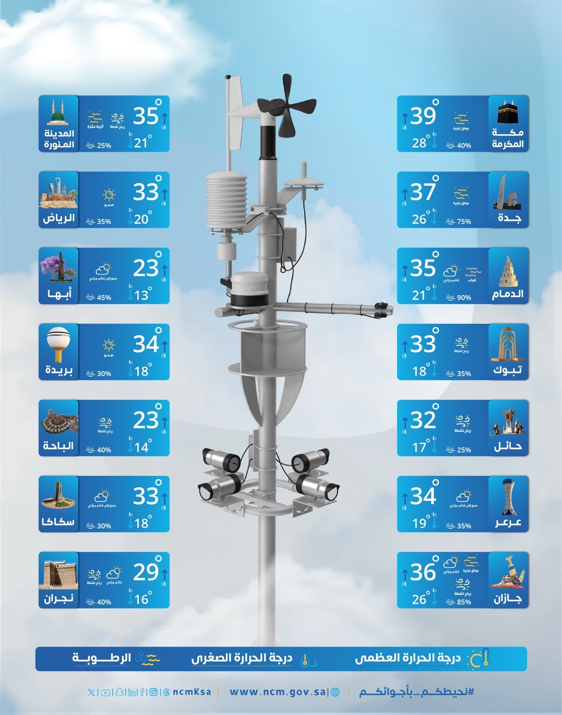 وأوضح التقرير أن حركة الرياح السطحية على البحر الأحمر ستكون شمالية غربية إلى غربية، تتحول مساءً إلى شرقية وشمالية شرقية على الجزء الشمالي، وجنوبية شرقية إلى شمالية شرقية على الجزءين الأوسط والجنوبي، بسرعة تتراوح بين 10 و32 كم/ساعة، وارتفاع الموج من نصف متر إلى متر، وحالة البحر خفيف الموج.