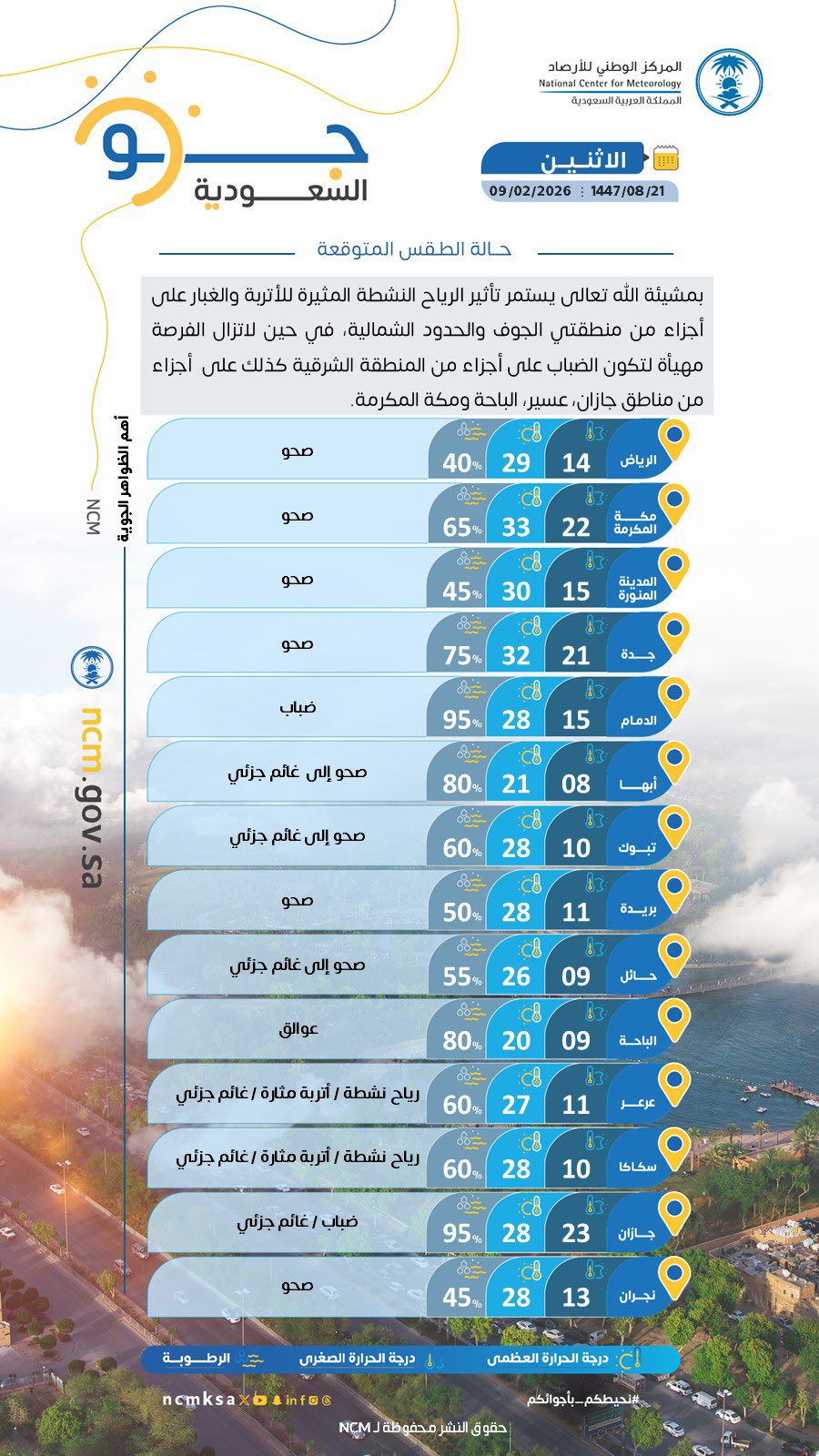 توقّع المركز الوطني للأرصاد، في تقريره عن حالة الطقس لهذا اليوم ـ بمشيئة الله تعالى ـ استمرار تأثير الرياح النشطة المثيرة للأتربة والغبار على أجزاء من منطقتي الجوف والحدود الشمالية، في حين يُتوقّع تكوّن الضباب على أجزاء من المنطقة الشرقية، وكذلك على أجزاء من مناطق جازان، عسير، الباحة، ومكة المكرمة.