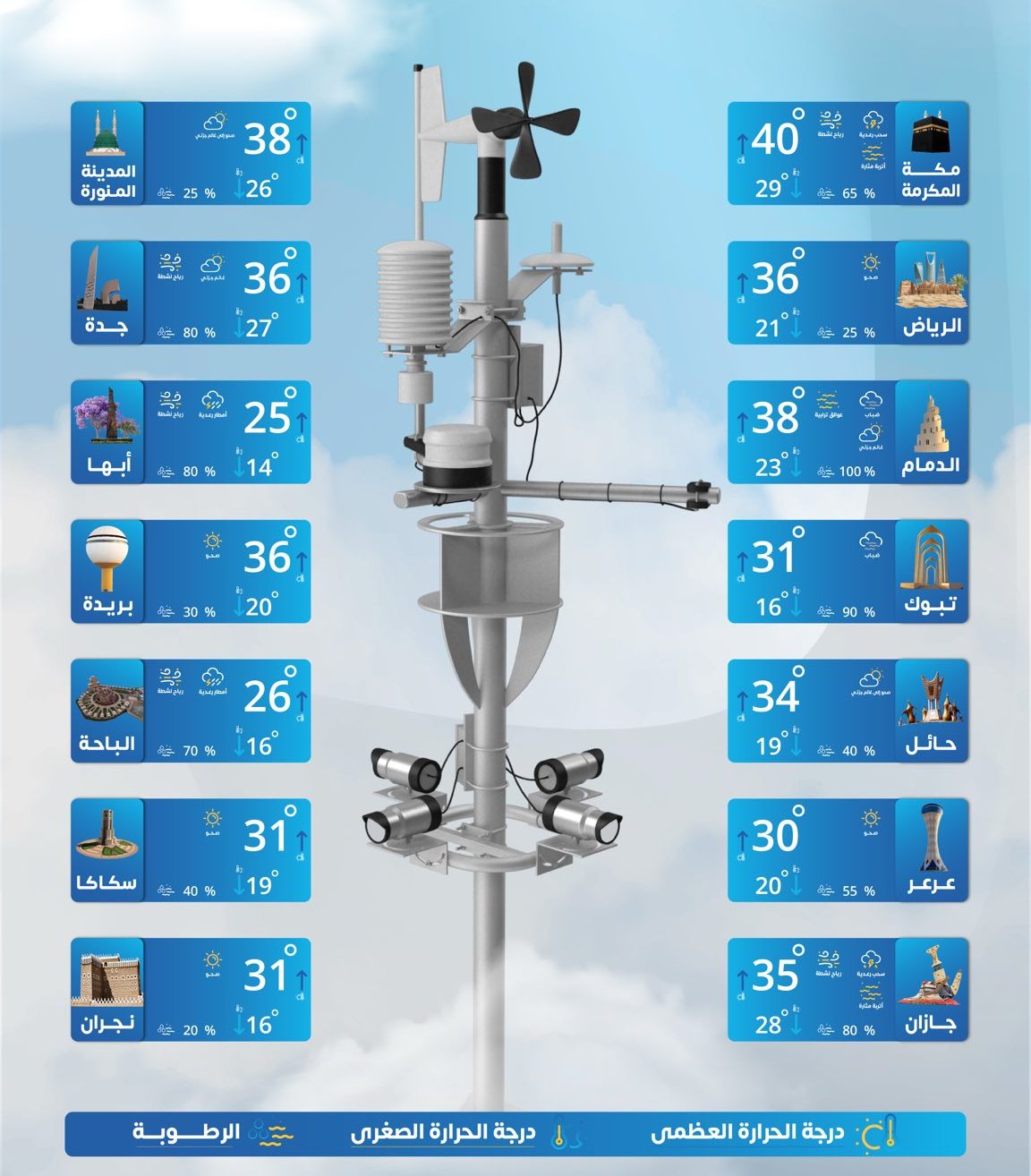 صراحة – واس : توقّع المركز الوطني للأرصاد في تقريره عن حالة الطقس اليوم -بمشيئة الله تعالى- استمرار هطول الأمطار الرعدية المصحوبة بزخات من البرد ورياح نشطة على أجزاء من مناطق جازان، عسير، الباحة، مكة المكرمة, مع فرصة تكوّن الضباب على أجزاء من تلك المناطق وأجزاء من مناطق الجوف، تبوك, الشرقية.