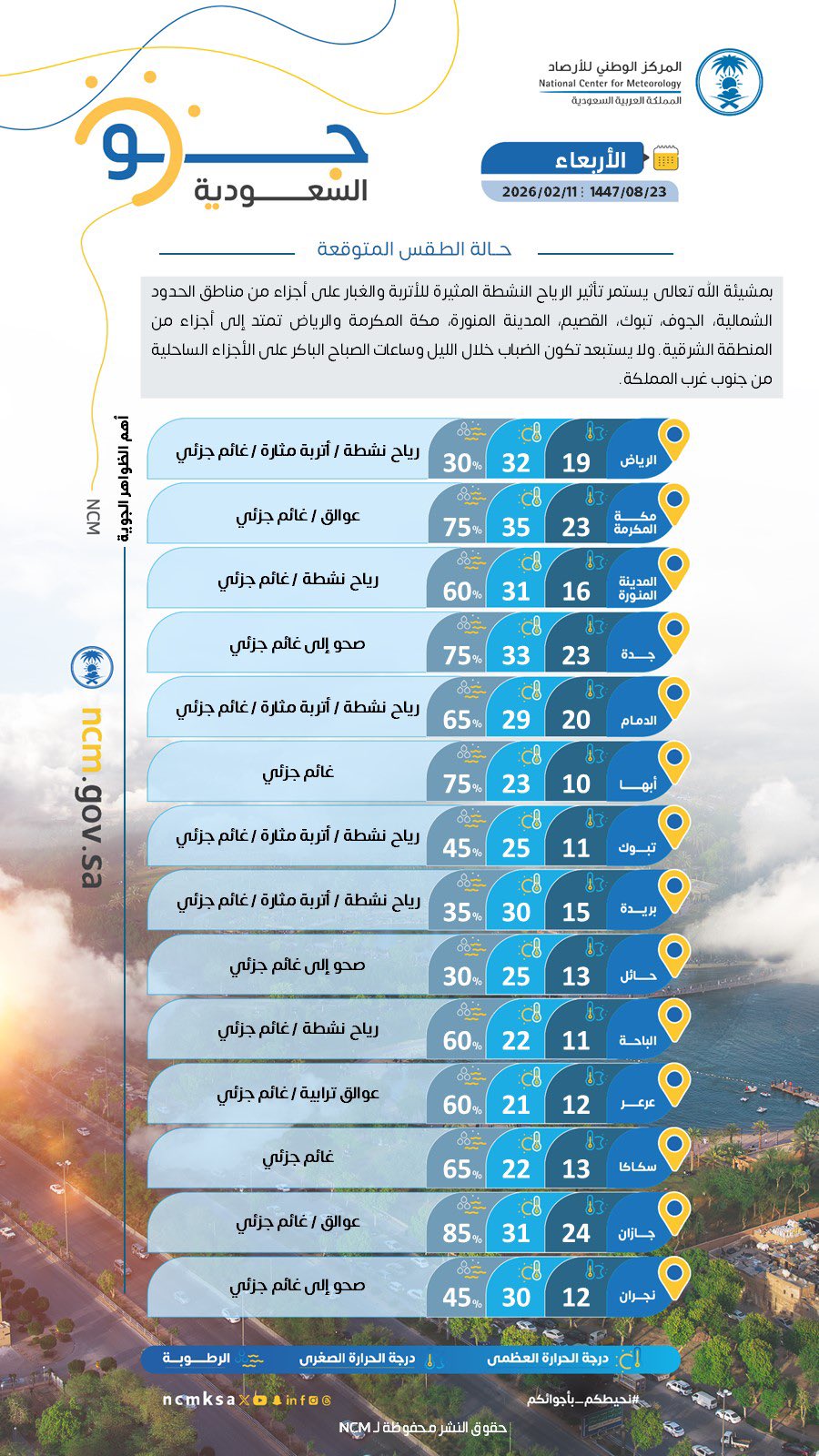 توقّع المركز الوطني للأرصاد في تقريره اليومي عن حالة الطقس – بمشيئة الله تعالى – تأثر عدد من مناطق المملكة برياح نشطة مثيرة للأتربة والغبار، تشمل أجزاءً من مناطق الحدود الشمالية، الجوف، تبوك، القصيم، المدينة المنورة، مكة المكرمة والرياض، تمتد إلى أجزاء من المنطقة الشرقية.