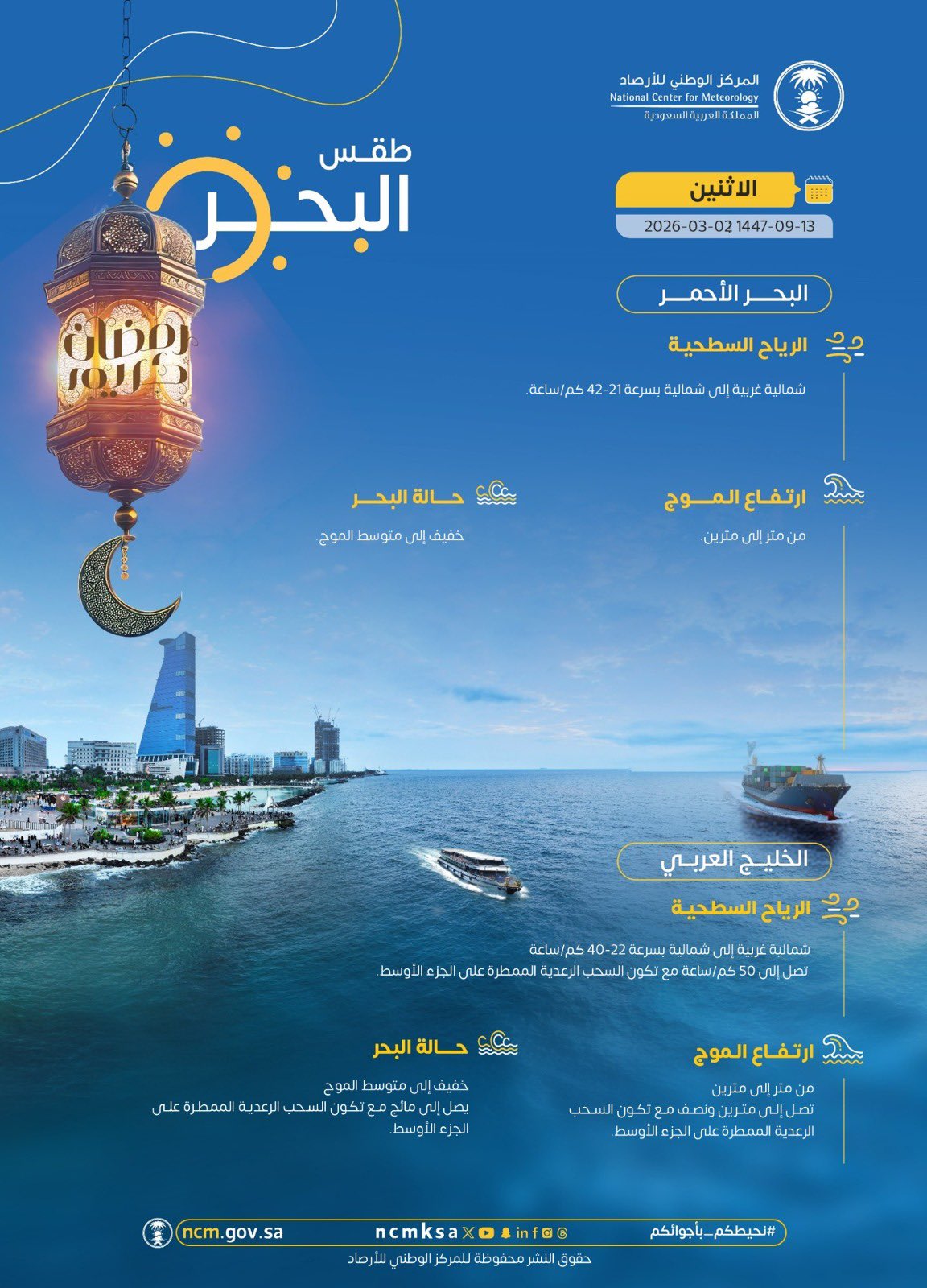 الرياح السطحية على البحر الأحمر شمالية غربية إلى شمالية بسرعة 21–42 كم/ساعة، وارتفاع الموج من متر إلى مترين، وحالة البحر خفيف إلى متوسط الموج.