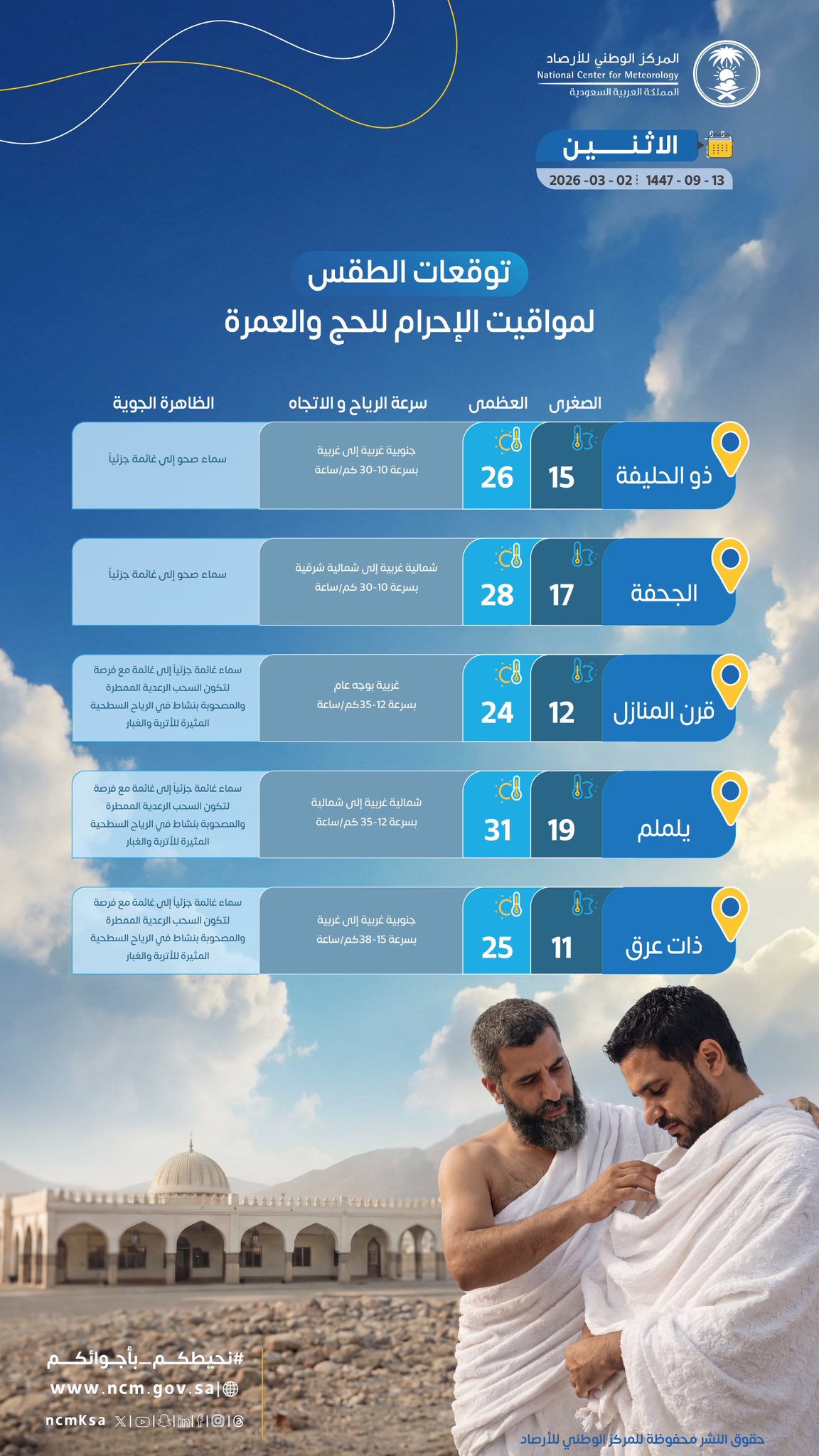 وأوضح التقرير أن الرياح النشطة المثيرة للأتربة والغبار ستؤثر كذلك على أجزاء من تلك المناطق، وتمتد إلى مناطق الجوف وحائل والقصيم، مع احتمالية تكوّن الضباب خلال الليل وساعات الصباح الباكر على أجزاء من المرتفعات الغربية والجنوبية الغربية للمملكة.