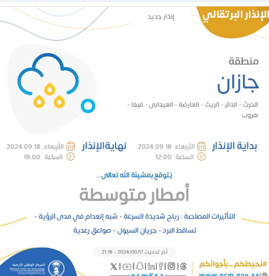 حتى الـ 7 مساءً .. تنبيه من أمطار متوسطة على #جازان
