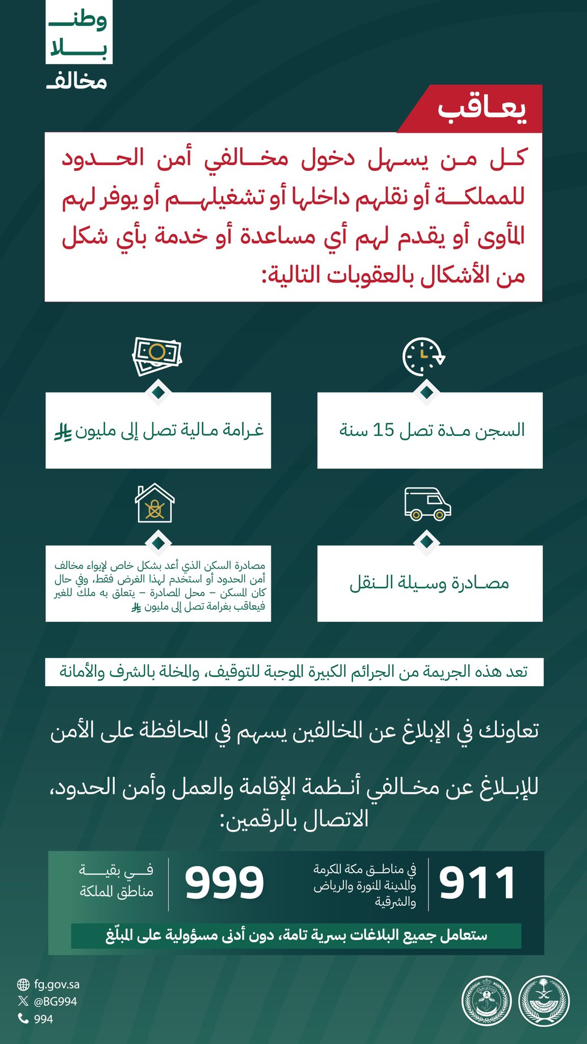 وأكدت وزارة الداخلية أن التعاون في الإبلاغ عن المخالفين يسهم في تعزيز الأمن، ودعت إلى الإبلاغ عن مخالفات أنظمة الإقامة والعمل وأمن الحدود عبر الرقم 911 في مناطق مكة المكرمة والمدينة المنورة والرياض والشرقية، وعبر الرقم 999 في بقية مناطق المملكة، مشيرةً إلى أن جميع البلاغات تُعامل بسرية تامة ودون أي مسؤولية على المُبلِّغ.