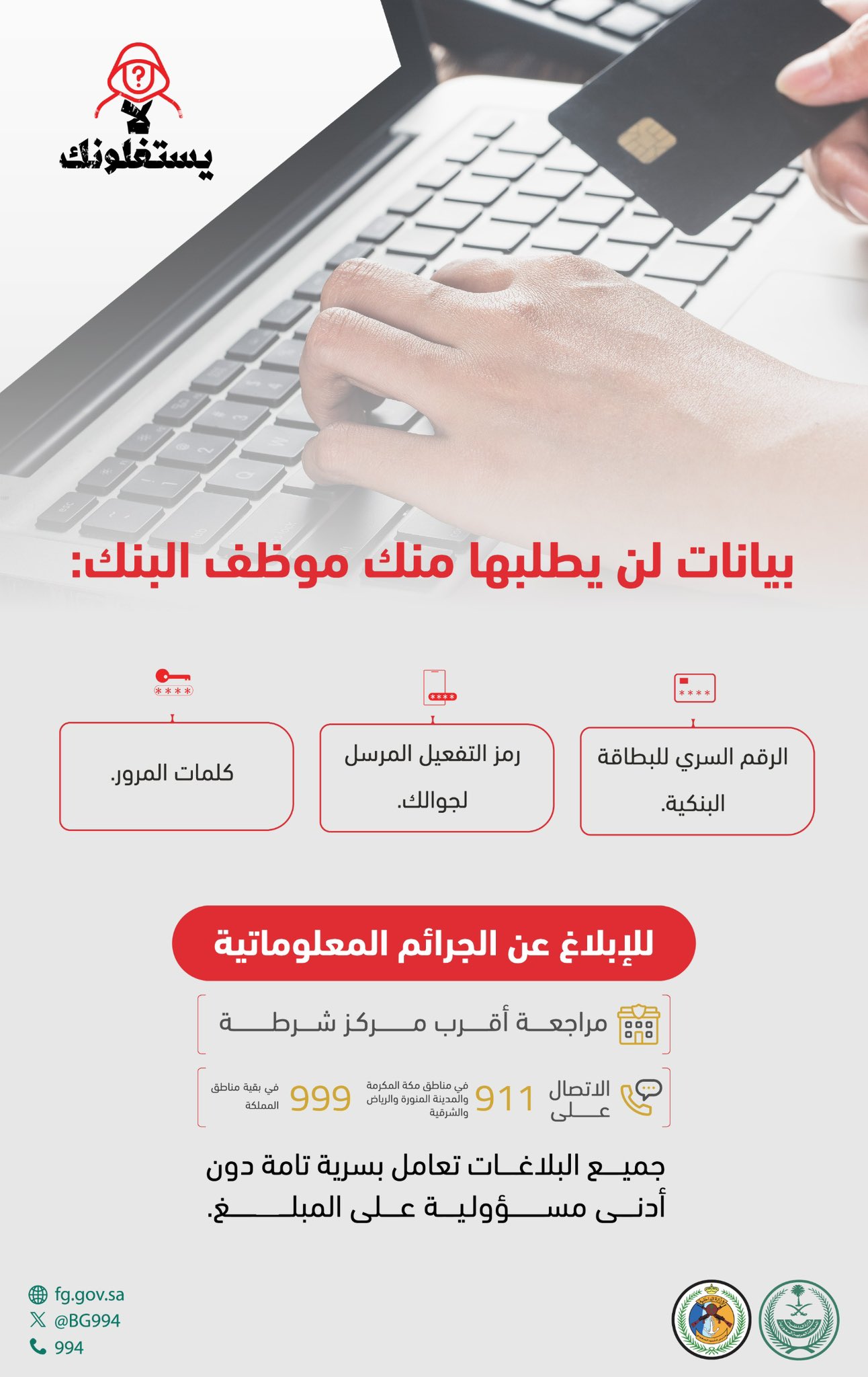 موظف البنك لا يطلب الرقم السري للبطاقة أو رموز التفعيل أو كلمات المرور