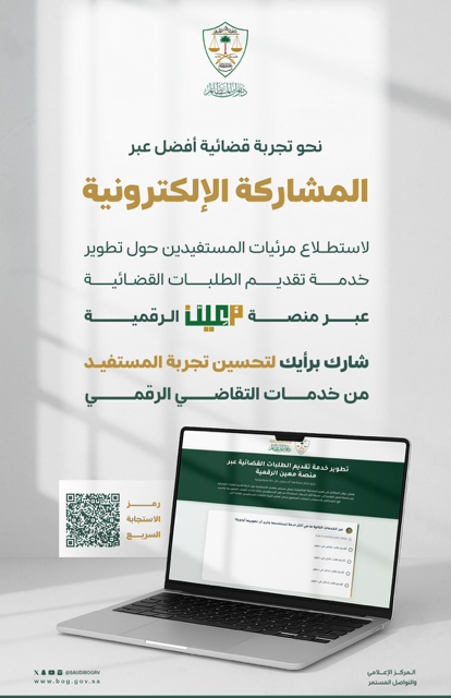 “ديوان المظالم” يدعو المستفيدين للمشاركة في تحسين خدمة الطلبات القضائية عبر منصة “مُعين” الرقمية